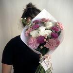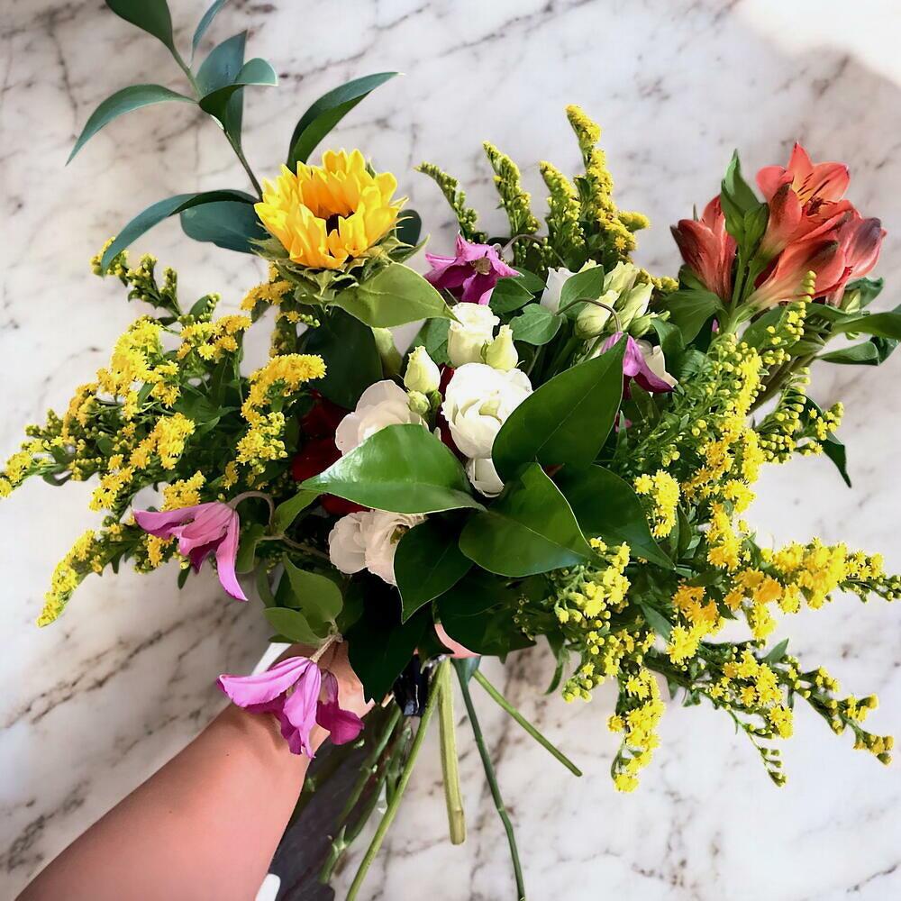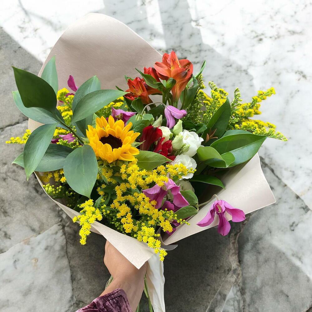 claveles - 7 ud. rosas blancas - 6 ud. hipericum - 2 ud. crisantemos - 5 ud. - 1 ud. solidago - 3 ud. clematis - 3 ud. lisanthius - 2 ud. astromelia - 2 ud. follaje - 3 ud. girasoles - 1 ud. - 1 ud.