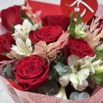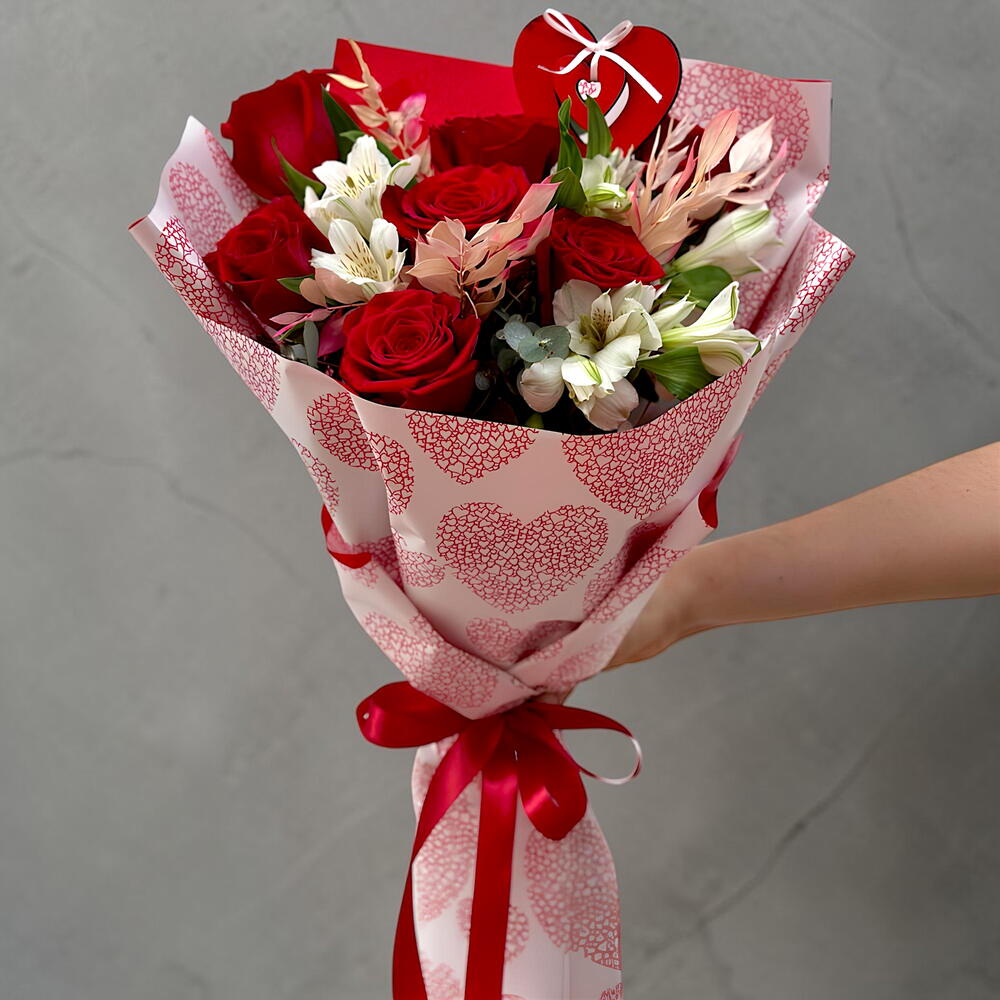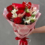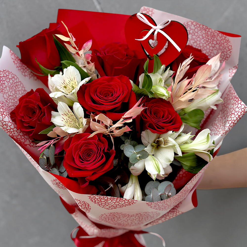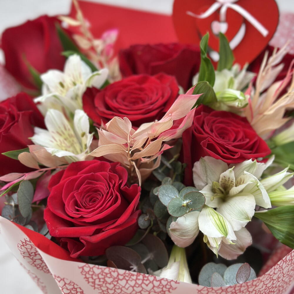 alstroemerias - 3 ud. cinta - 1 ud. rosas rojas - 7 ud. eucalipto cinerea - 5 ud. ruscus preservado - 3 ud. embalaje de diseño - 3 ud. corazón decorativo - 1 ud.