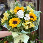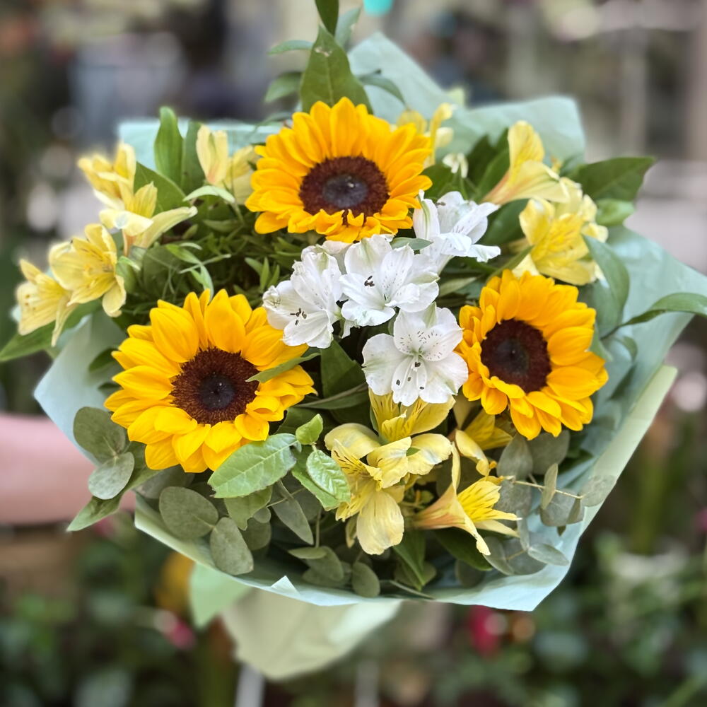 Un ramo radiante y lleno de alegría, donde los girasoles iluminan la frescura de las alstroemerias blancas y amarillas. El contraste entre el dorado brillante y la pureza de los tonos claros transmite calidez, felicidad y energía positiva. Un detalle perfecto para regalar un pedacito