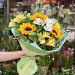 eucalipto - 3 ud. girasol - 3 ud. alstroemeria blanca - 1 ud. alstroemeria amarilla - 3 ud.