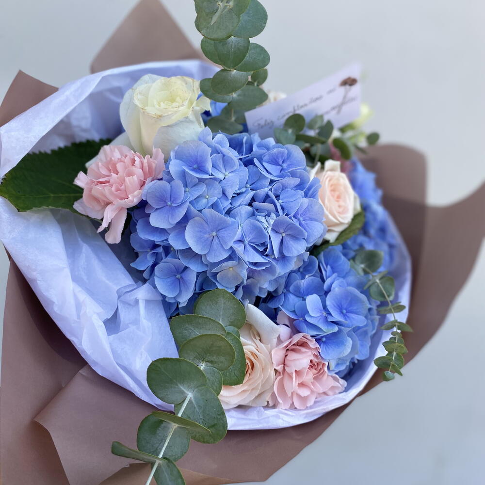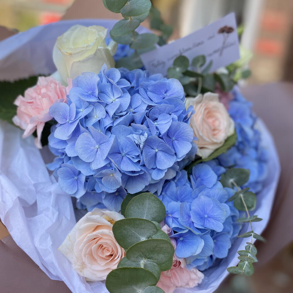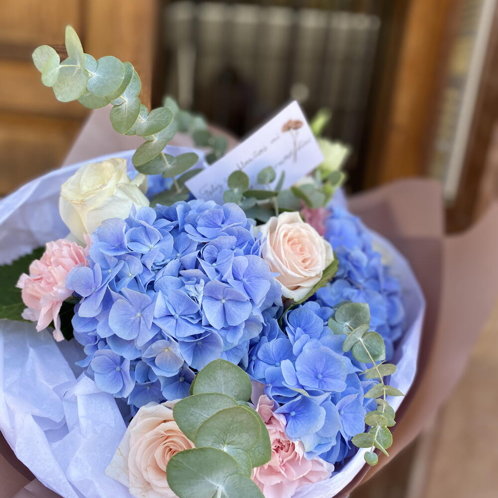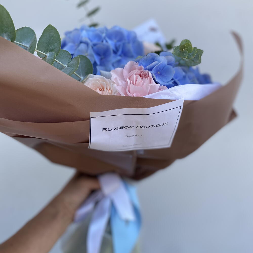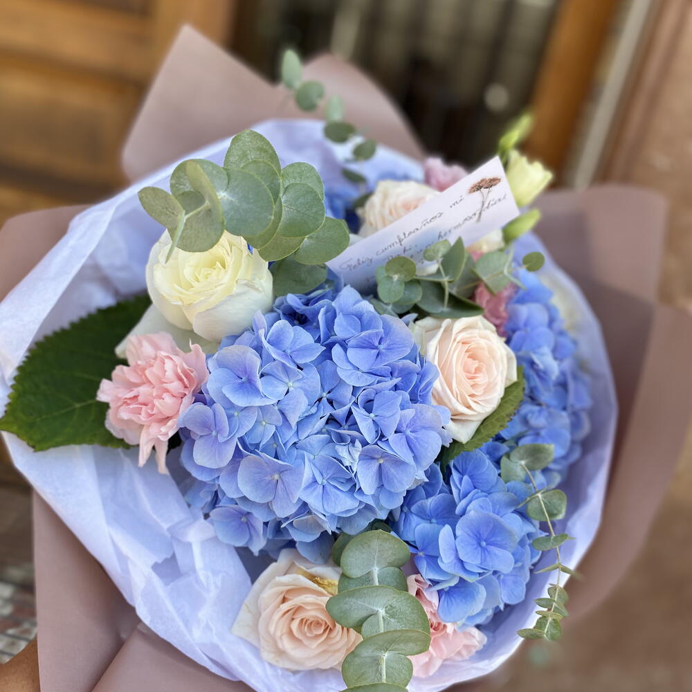 Diseño floral de alta gama. Este ramo combina la espectacular estructura de la Hortensia Holandesa con la delicadeza de los tonos pastel, creando una composición voluminosa, fresca y profundamente elegante. Es un arreglo que respira calma y sofisticación. Composición detallada: • 4 Hortensias Holandesas Azules: Flores de exportación seleccionadas por su tamaño XL y su color vibrante. • Rosas Color Crema: Rosas premium que aportan una luz suave y un toque de romance clásico. • Claveles Rosados: Añaden una textura rizada encantadora y simbolizan la gratitud y el afecto. • Follaje de Eucalipto: Ramas seleccionadas para dar movimiento, un toque silvestre y un aroma fresco inolvidable. • Diseño de Autor: Envoltorio bitono de alta calidad (estilo Blossom Boutique) con cinta y lazo de algodón ecológico. Ideal para: Perfecto para sorprender en cumpleaños, celebrar un aniversario o enviar un mensaje de recupérate pronto. Su paleta de colores es ideal para transmitir paz y alegría con un gusto impecable. • Tip de cuidado: Las hortensias aman el agua; asegúrate de mantener el jarrón bien lleno para que luzcan perfectas por días.