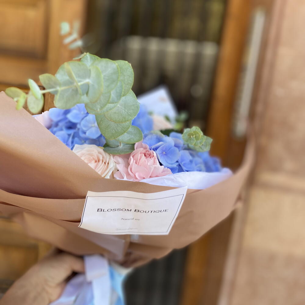 eucalipto - 5 ud. rosas crema - 4 ud. hortensias azules holandesas - 5 ud. claveles rosados suave - 5 ud. papel floral impermeable - 2 ud. cintas azul celeste y blanca - 1 cm