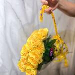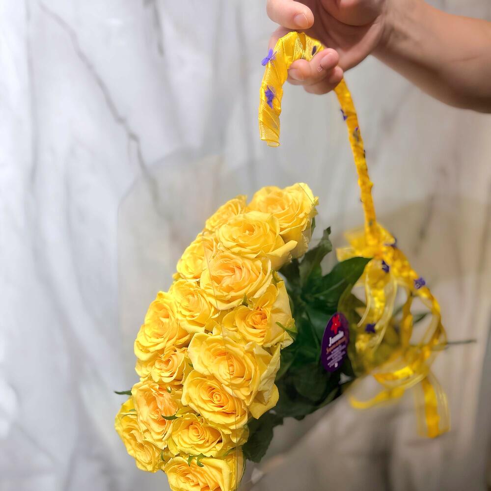 Este encantador ramo de rosas amarillas transmite energía, alegría y optimismo. Decorado con un lazo amarillo con detalles en morado y presentado en una elegante bolsa de asa, es perfecto para iluminar cualquier espacio o para expresar tus mejores deseos a esa persona especial.