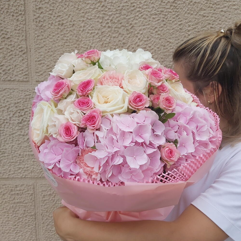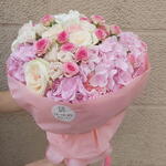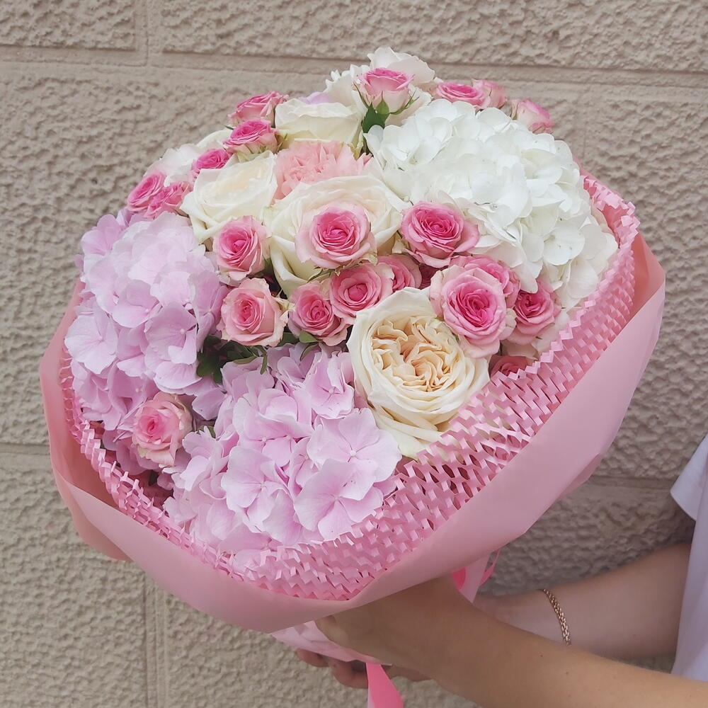 Este ramo es una oda a la delicadeza y la feminidad, con una combinación perfecta de hortensias rosas, rosas crema y rosas spray en tonos suaves. Cada flor está cuidadosamente seleccionada para crear una armonía visual que encanta a primera vista. Las hortensias aportan volumen y textura, mientras que las rosas añaden un toque clásico y romántico. Perfecto para celebrar momentos especiales como cumpleaños, aniversarios o simplemente para sorprender a alguien querido. La envoltura rosada con detalles elegantes refuerza el encanto del ramo, convirtiéndolo en un regalo memorable.