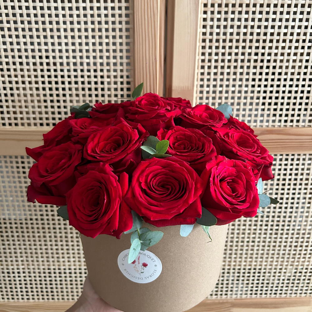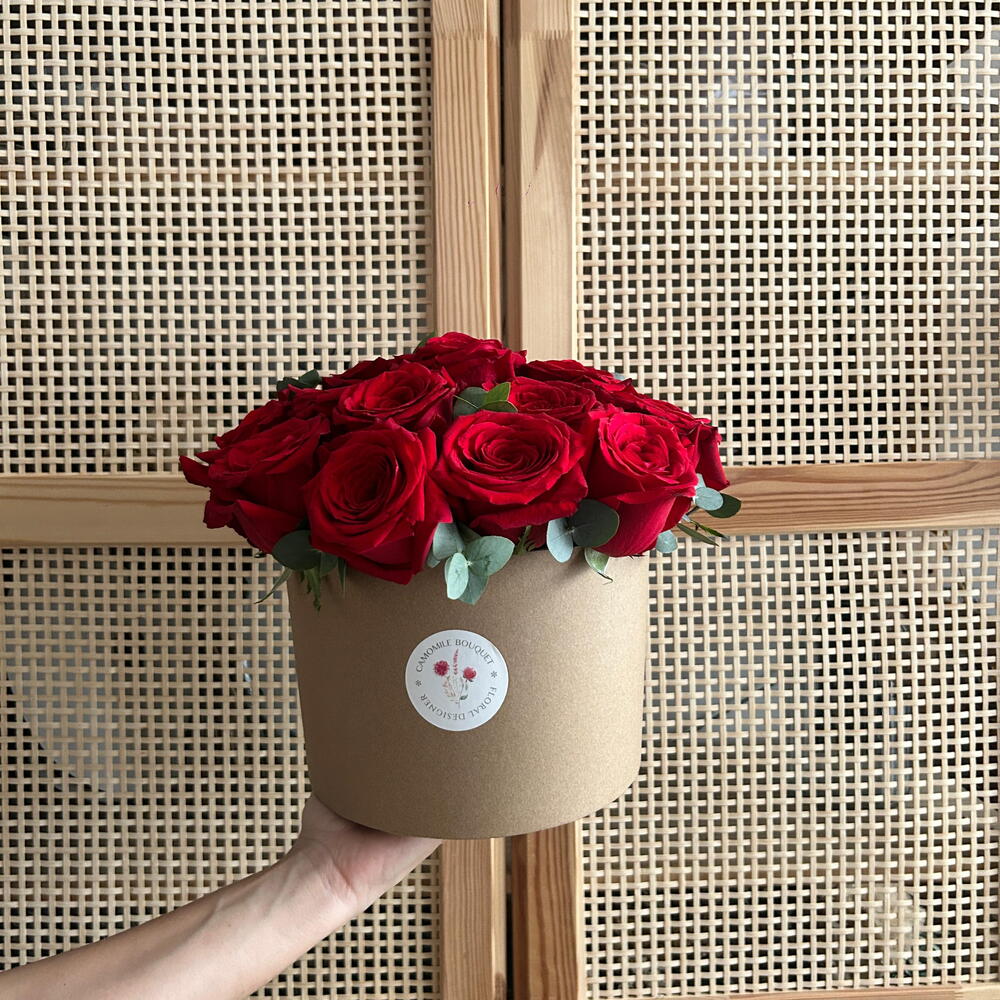 Arreglo floral elegante y compacto presentado en una caja cilíndrica de estilo minimalista, compuesto por rosas rojas intensas dispuestas de forma densa y perfectamente alineada. Este ramo de flores para regalo transmite pasión, lujo y sofisticación, siendo una opción ideal como flores para mujer, arreglo floral romántico o flores para ocasión especial. Los verdes variados aportan un contraste natural que realza la profundidad del color rojo y equilibra la composición. Un ramo exclusivo y refinado, perfecto como decoración floral moderna o detalle floral elegante para sorprender con un gesto clásico y poderoso.