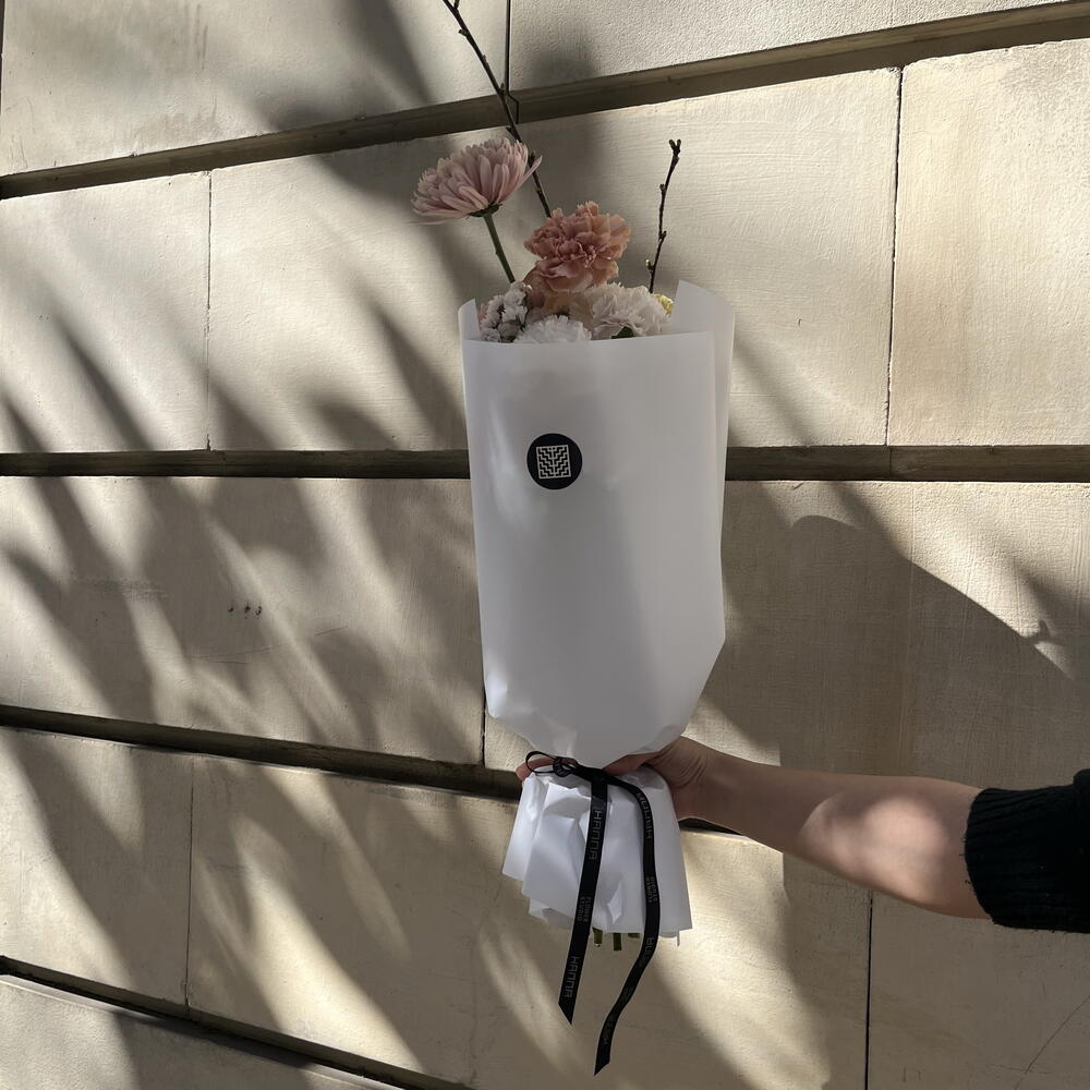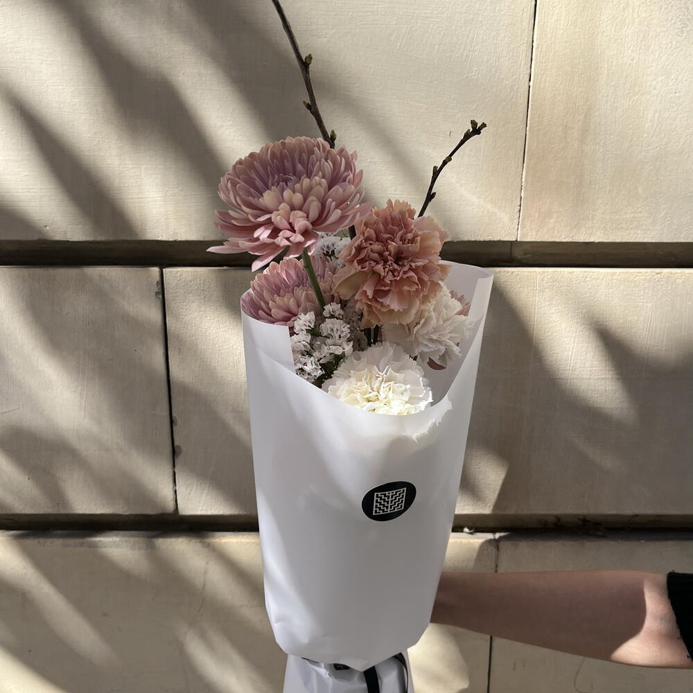 Statice - 3 ud. El crisantemo - 3 ud. rose - 1 ud. carnation - 5 ud. rama de cerezo en flor - 2 ud.