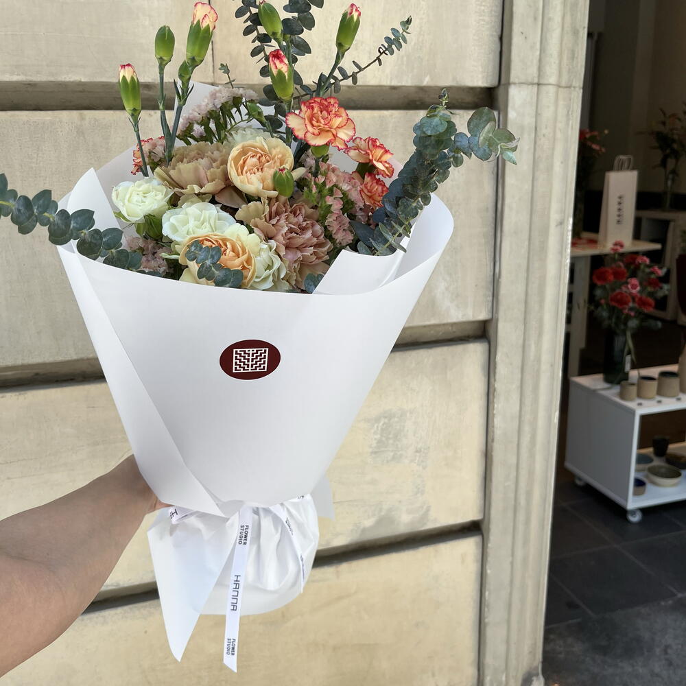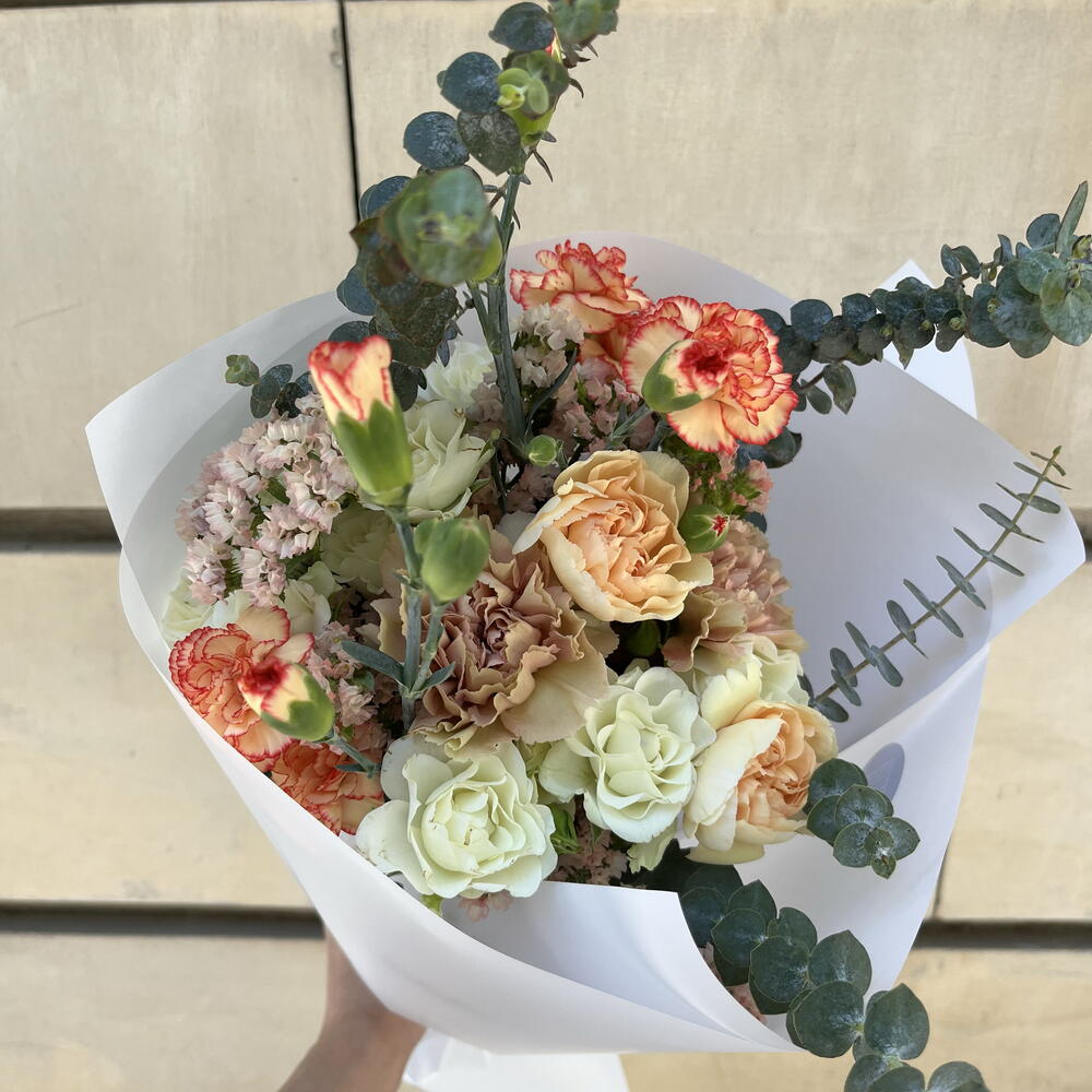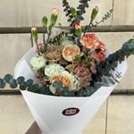 Estática - 5 ud. Mini rose - 3 ud. carnation - 6 ud. eucalipto - 4 ud.