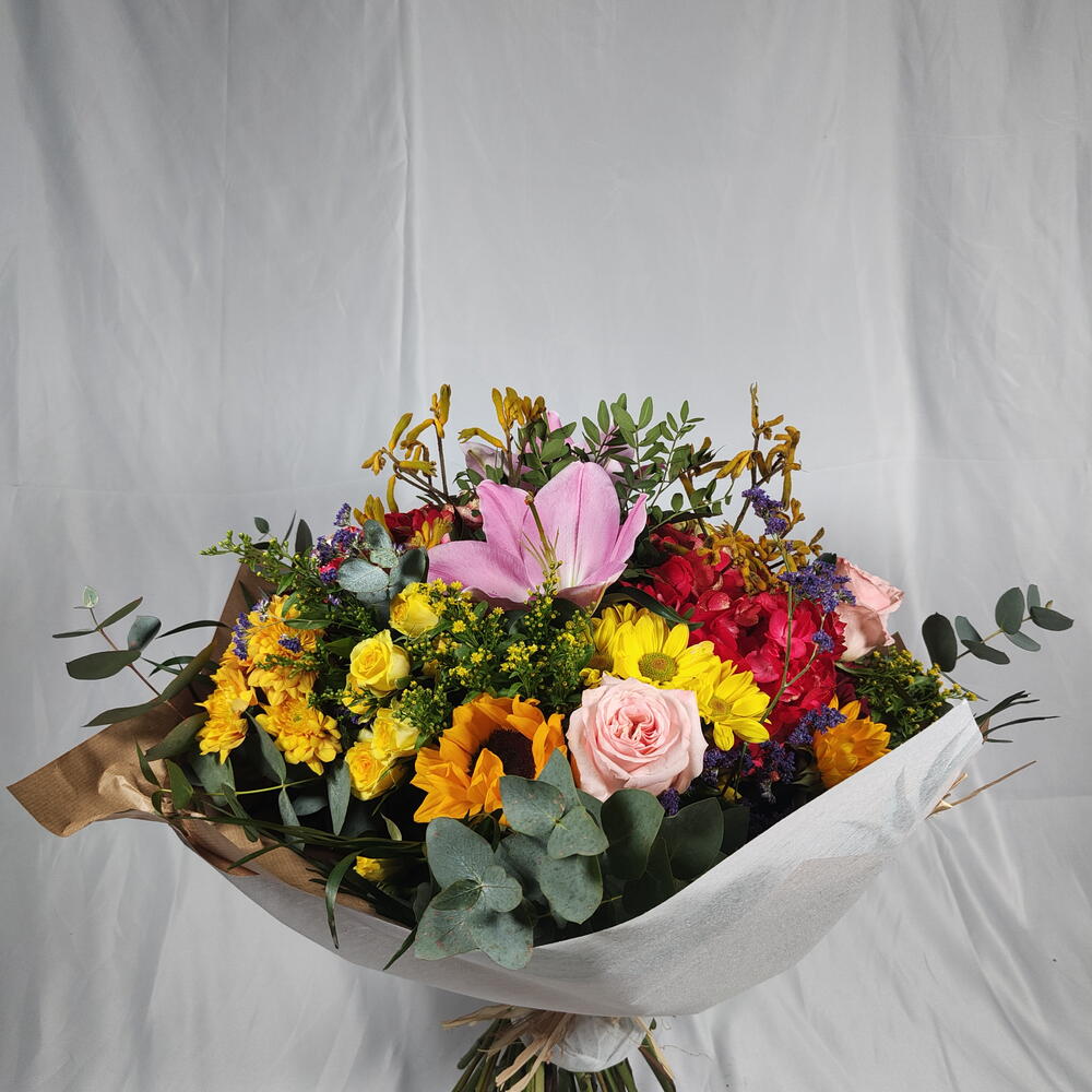 Limonium - 3 ud. Solidago - 4 ud. hortensia - 2 ud. eucalipto - 5 ud. rosas - 3 ud. margaritas - 5 ud. girasol - 3 ud. verdes variados - 5 ud. lilium oriental - 1 ud.