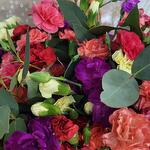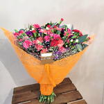 Un vibrante ramo lleno de vida, compuesto por claveles en tonos rojos, rosados y morados, acompañado de un delicado toque de flores blancas y hojas verdes. Este diseño alegre y colorido es perfecto para celebrar momentos especiales o simplemente para llenar de felicidad cualquier día. Envuelto en un papel naranja brillante, transmite calidez, entusiasmo y energía positiva. ¡Un regalo ideal para expresar alegría y cariño a tus seres queridos! Bouquet variado de clavelinas un multicolor, para alegrar un día de primavera