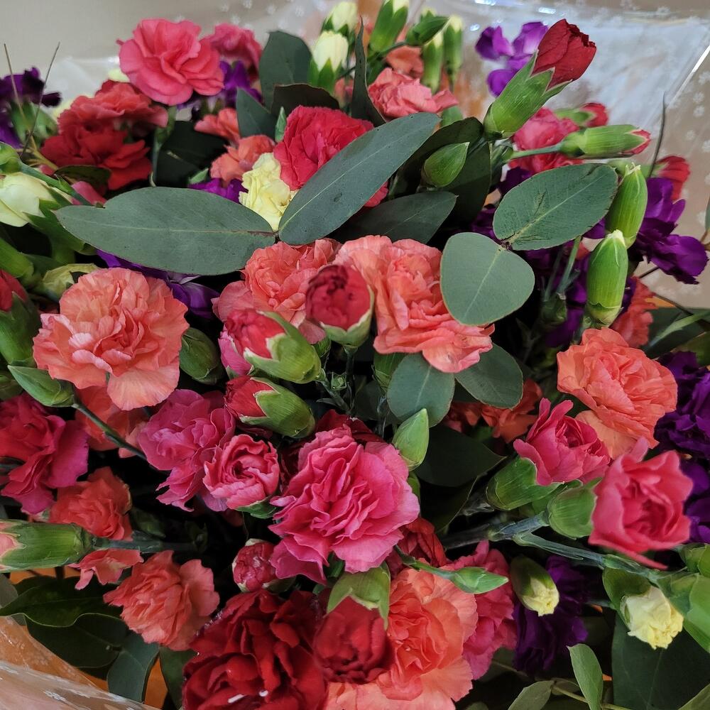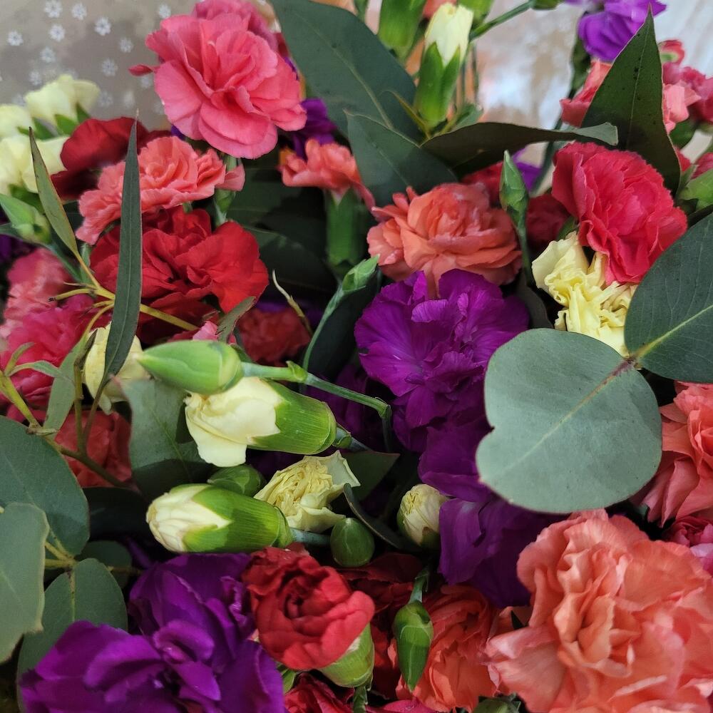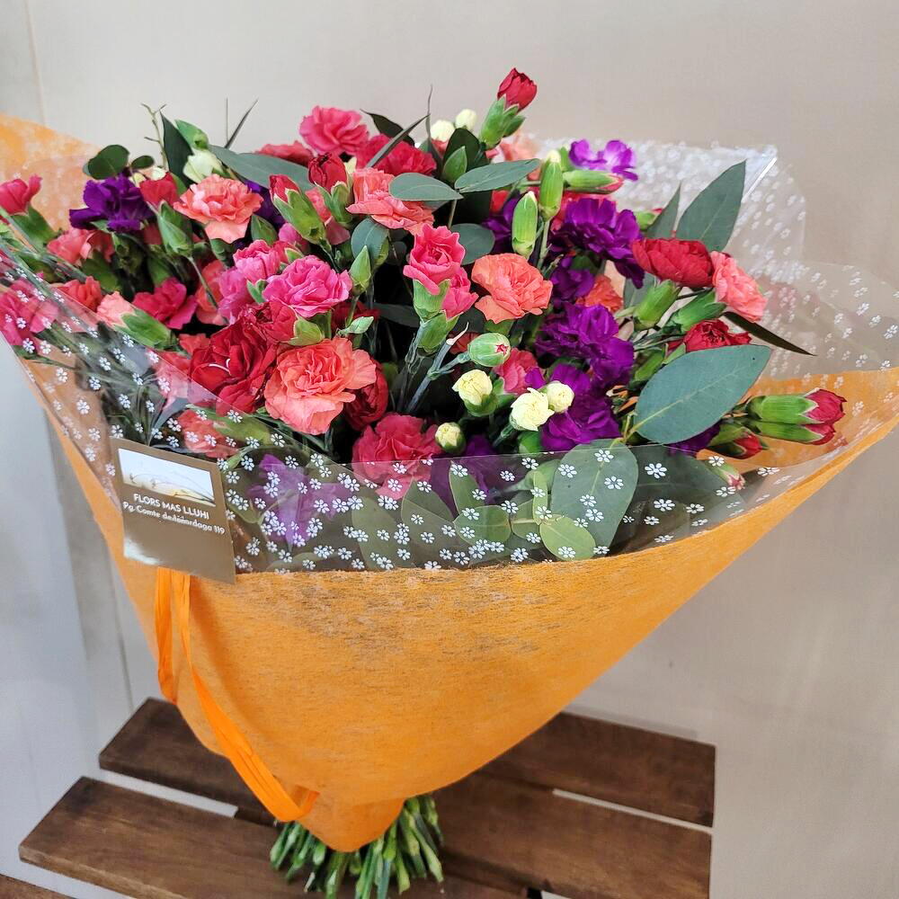 Un vibrante ramo lleno de vida, compuesto por claveles en tonos rojos, rosados y morados, acompañado de un delicado toque de flores blancas y hojas verdes. Este diseño alegre y colorido es perfecto para celebrar momentos especiales o simplemente para llenar de felicidad cualquier día. Envuelto en un papel naranja brillante, transmite calidez, entusiasmo y energía positiva. ¡Un regalo ideal para expresar alegría y cariño a tus seres queridos! Bouquet variado de clavelinas un multicolor, para alegrar un día de primavera