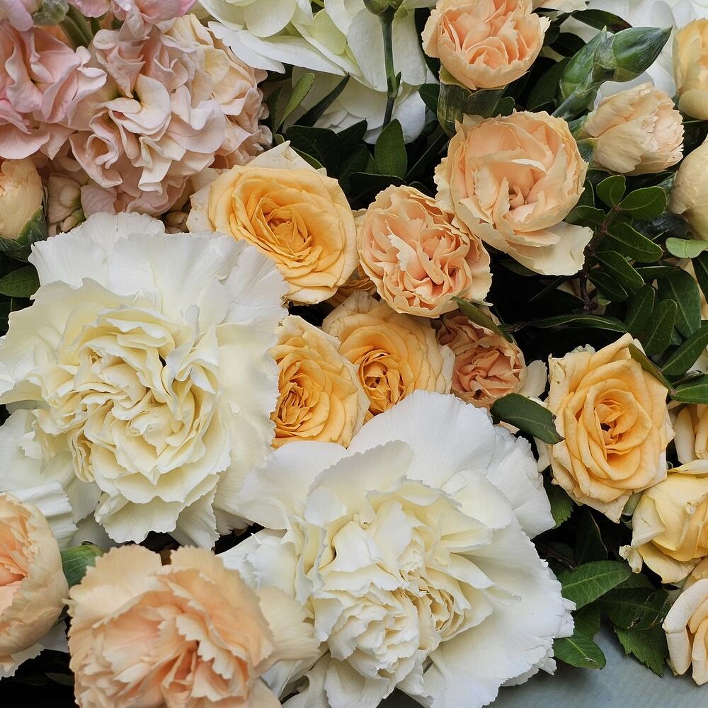 Un bouquet elegante y delicado que evoca frescura y sofisticación. Este arreglo combina la pureza de las hortensias blancas, la suavidad de los claveles y rosas crema, y los matices pastel de las flores rosadas. Ideal para ocasiones especiales como bodas, aniversarios o como un gesto de cariño y aprecio. Su diseño natural y equilibrado lo convierte en un detalle único y memorable. Recomendaciones de cuidado: Corta los tallos en diagonal antes de colocarlos en un jarrón con agua fresca y limpia. Cambia el agua cada dos días y retira las hojas inferiores para evitar que entren en contacto con el agua. Mantén el ramo en un lugar fresco, alejado de la luz solar directa y de corrientes de aire. ¡Disfruta de la elegancia y la belleza duradera de este bouquet exquisito!