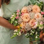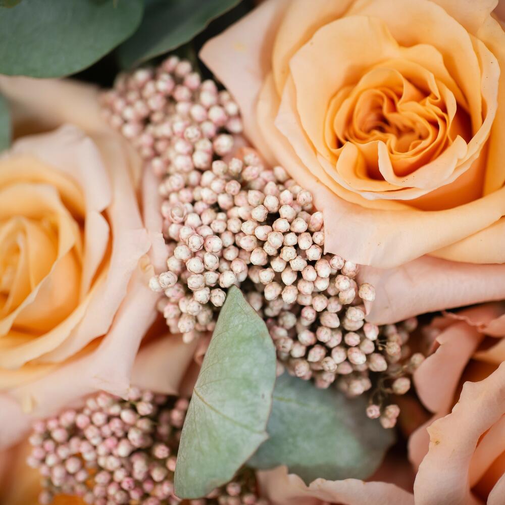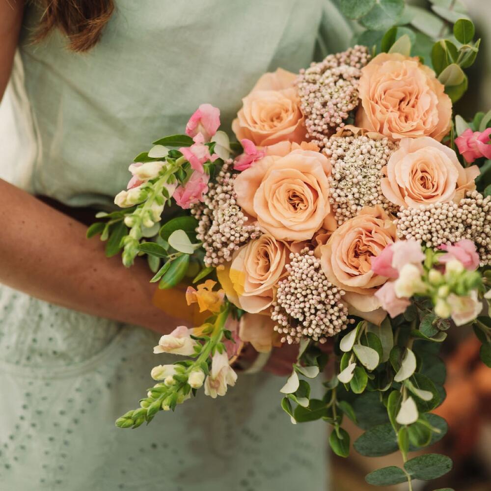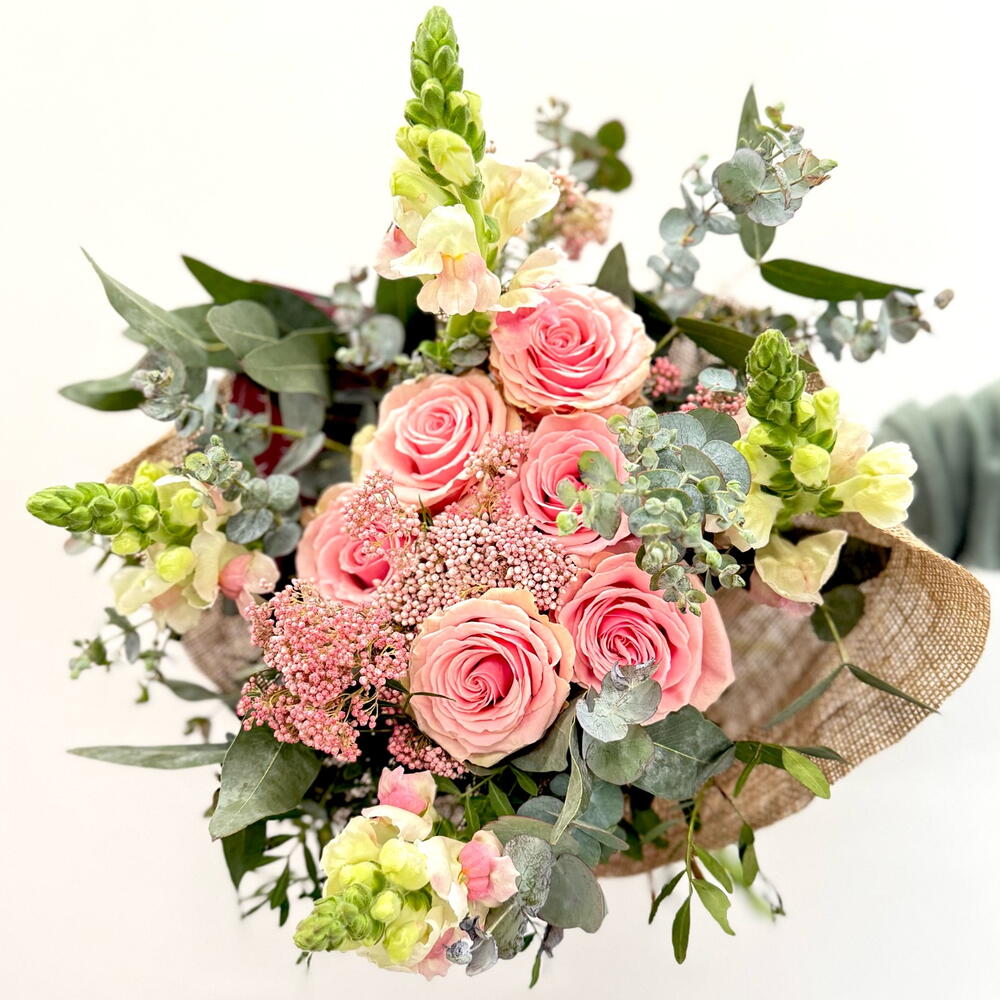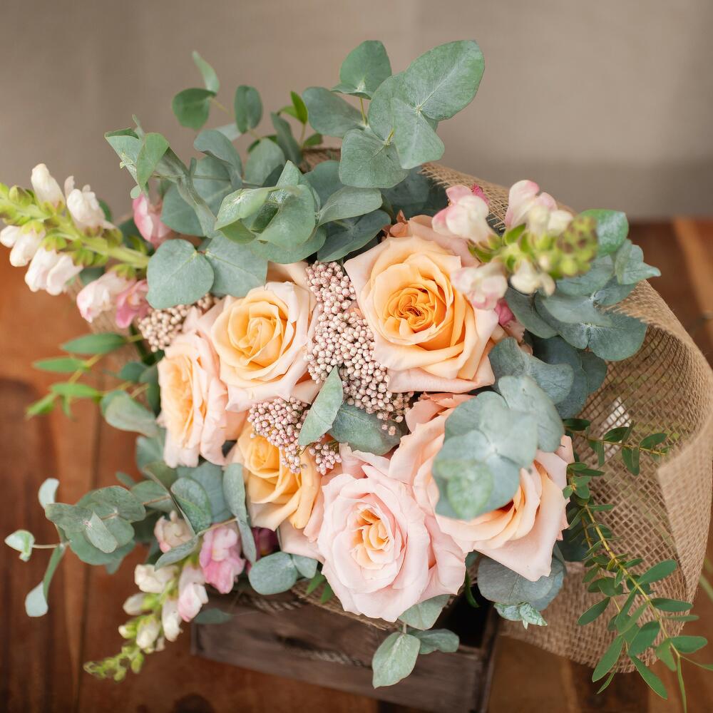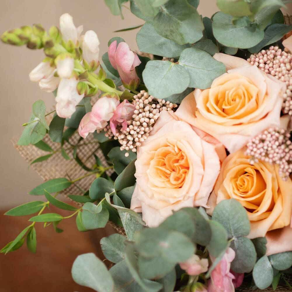 rosa - 6 ud. alhelíes - 3 ud. flor de relleno (eucalipto y flor de arroz) - 12 ud. envoltorio yute - 1 ud. etiqueta marcada a láser con mensaje personalizado - 1 ud.