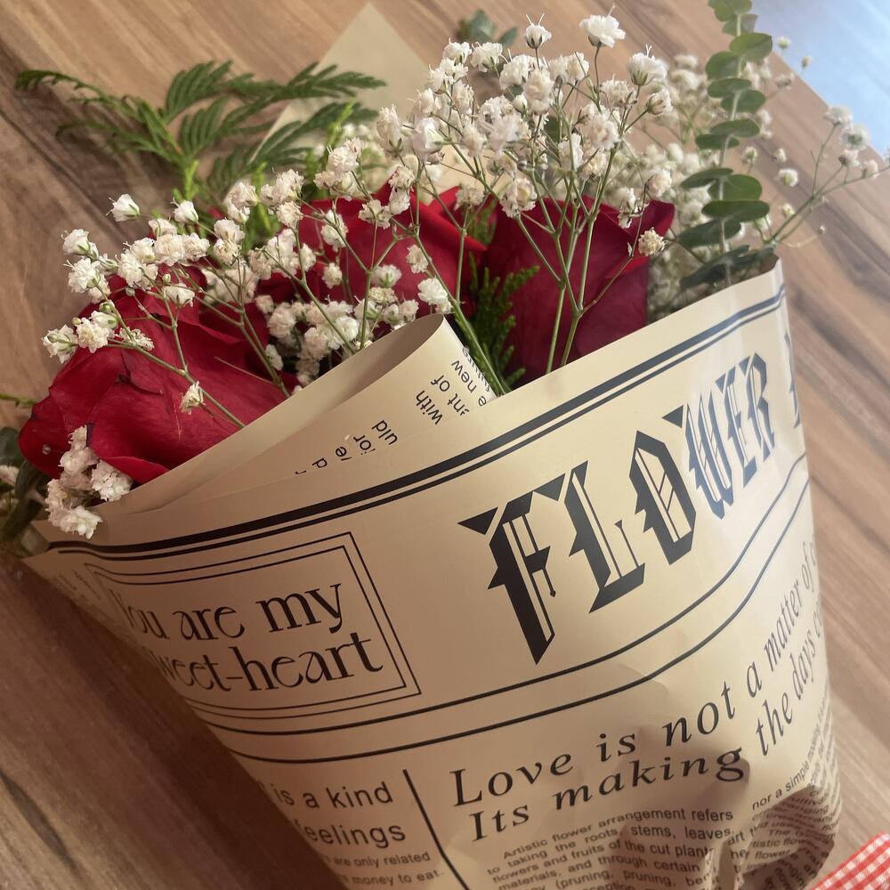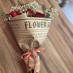 eucalipto - 3 ud. rosas rojas tallo largo - 5 ud. paniculata blanca - 4 ud. verdes varios - 3 ud. papel coreano y cinta - 1 ud.