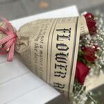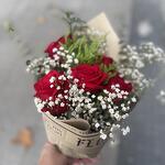 Este hermoso ramo clásico se compone de diversas flores y verdes seleccionados con esmero. Consta de 3 vibrantes tallos de eucalipto, 5 majestuosas rosas rojas de tallo largo, 4 suaves paniculatas blancas y 3 verdes varios. Todo está delicadamente envuelto en papel coreano y atado con una cinta, creando una presentación elegante y atractiva. Ideal para regalar en ocasiones especiales o simplemente para alegrar cualquier día.