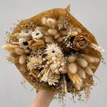 Un ramo seco elegante y sofisticado en tonos cálidos y naturales que transmite calma, estilo y durabilidad. Su diseño combina texturas delicadas y elementos preservados que mantienen su belleza durante mucho tiempo sin necesidad de mantenimiento intensivo. La paleta beige y crema lo convierte en una pieza decorativa perfecta para interiores modernos y уютные espacios. Ideal para ocasiones como aniversarios, decoración del hogar, regalos corporativos o detalles especiales que perduren en el tiempo. Este arreglo es una excelente alternativa a los ramos frescos, ya que conserva su encanto por meses. Para su cuidado, se recomienda mantenerlo en un lugar seco, evitar la humedad y la luz solar directa, y no regarlo. También es importante manipularlo con cuidado para evitar que los elementos secos se dañen.