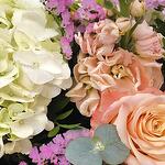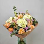 Statice - 7 ud. Eucalyptus - 3 ud. craft paper - 3 ud. matthiola - 5 ud. hortensia white - 3 ud. rosa jardín - 5 ud. lentisco - 1 ud.