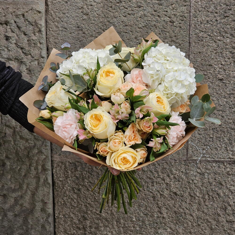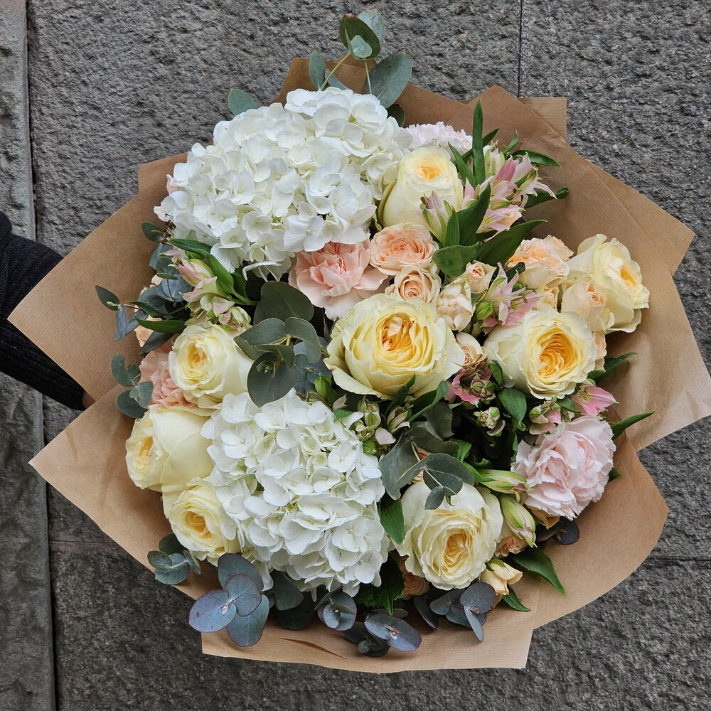 Eucalyptus - 1 ud. Alstroemeria - 10 ud. hortensia - 2 ud. craft paper - 1 ud. claveles - 10 ud. rosa spray - 5 ud. rosa jardín - 8 ud.