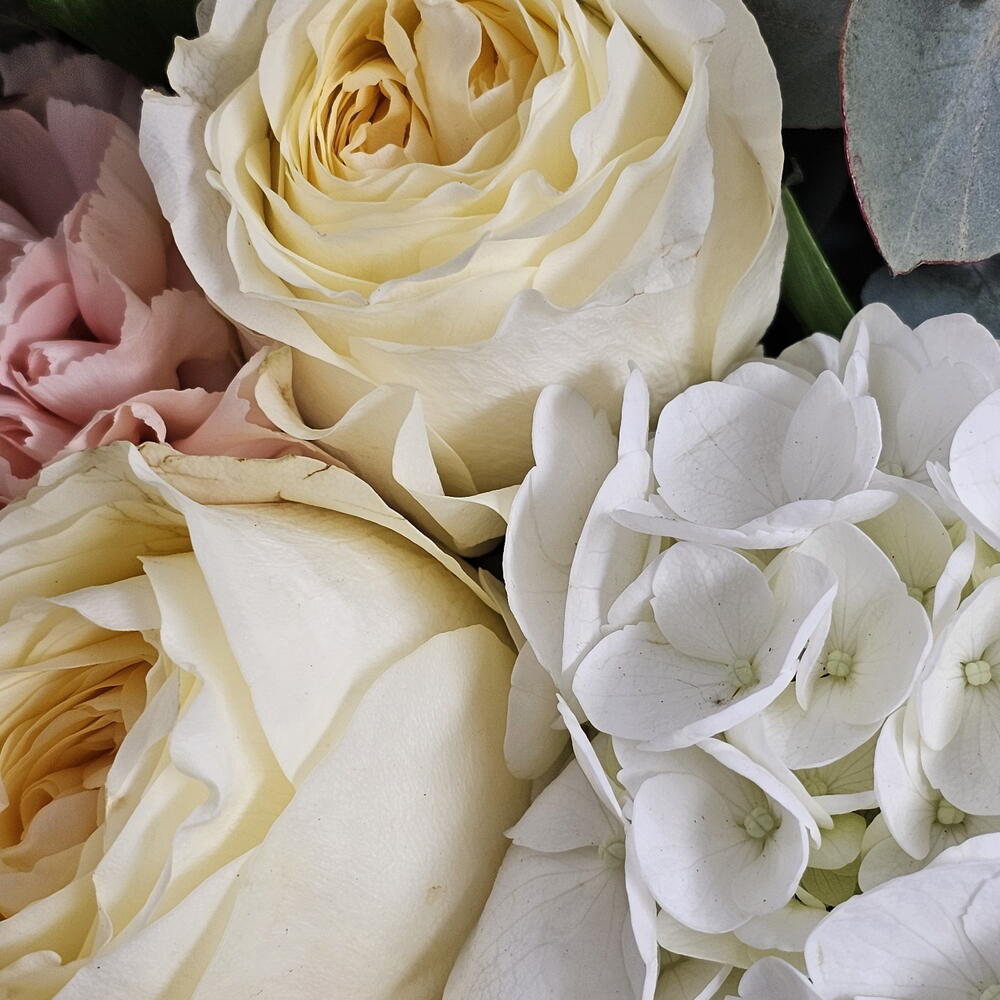 Un bouquet delicado y sofisticado en tonos crema y blancos que evoca pureza y elegancia. Las rosas amarillas y melocotón se combinan con suaves hortensias blancas y toques de follaje de eucalipto, creando un equilibrio perfecto de frescura y armonía. Este arreglo es ideal para bodas, aniversarios o como un gesto lleno de ternura y sofisticación. Recomendaciones de cuidado: corta los tallos en diagonal antes de colocarlo en un jarrón con agua limpia. Cambia el agua cada dos días y mantén el ramo en un lugar fresco, alejado de la luz solar directa y corrientes de aire. ¡Un regalo que expresa los sentimientos más sinceros!