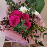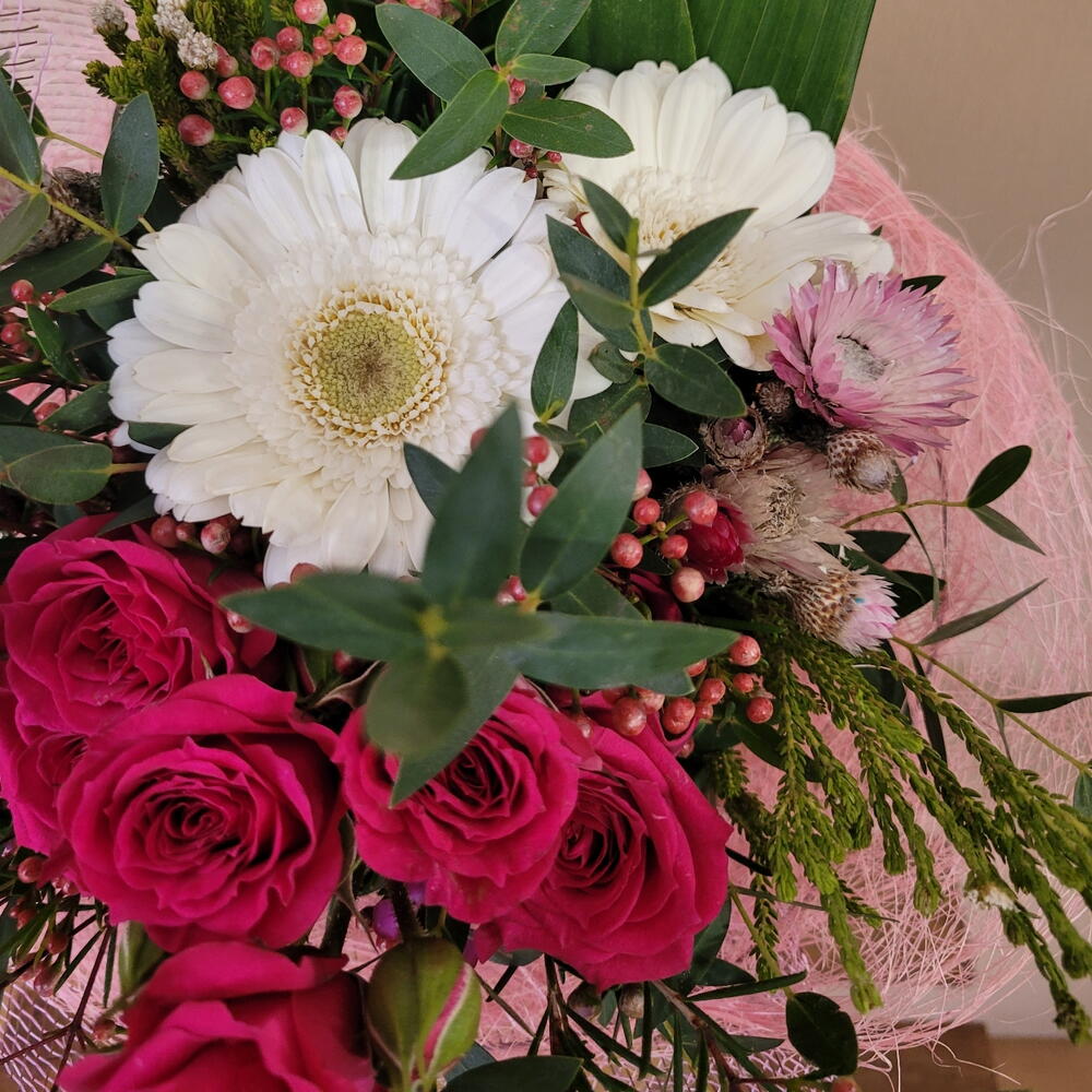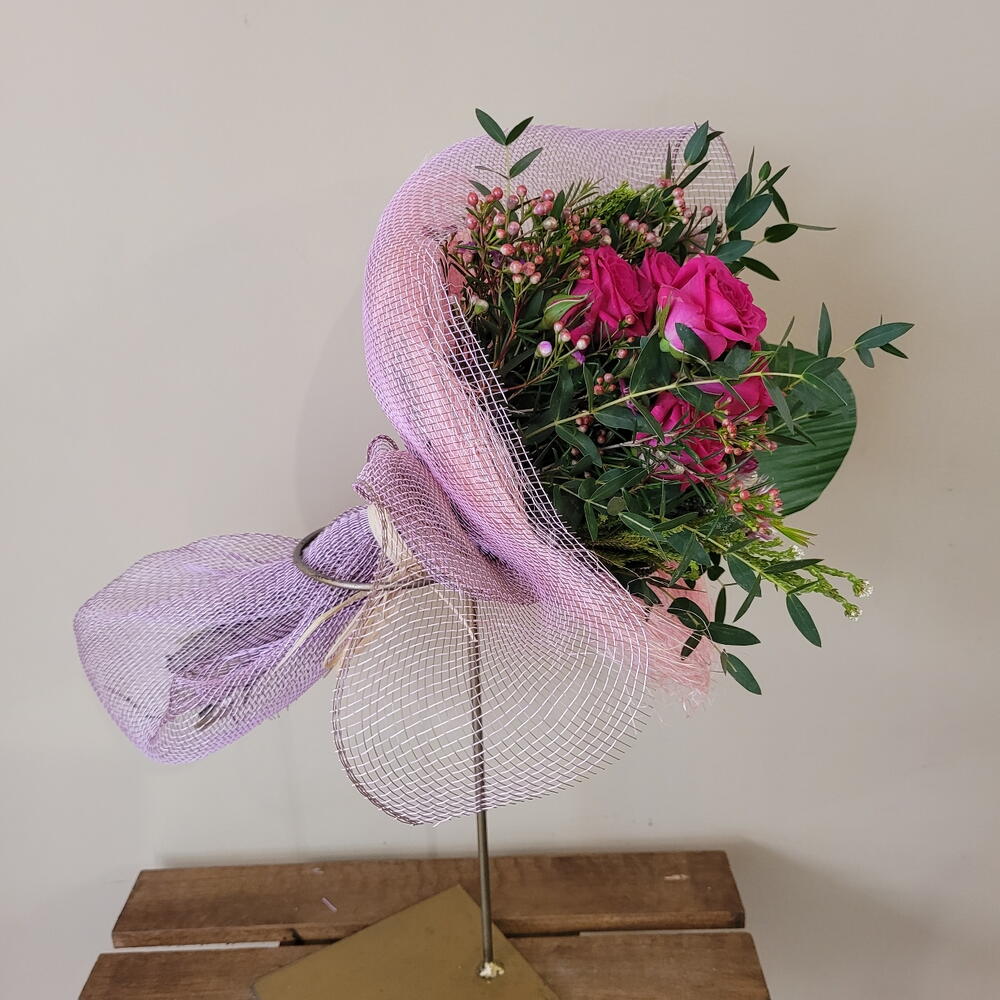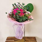Un ramo encantador que combina vibrantes rosas fucsias con delicadas flores silvestres y un fresco follaje verde. Su envoltura en malla lila y el elegante diseño lo convierten en un regalo perfecto para transmitir alegría, amor o gratitud. Cada flor está cuidadosamente seleccionada para crear una composición armoniosa y llena de vida. Ideal para ocasiones especiales o para sorprender a alguien querido con un detalle que expresa emociones sinceras. ¡Un arreglo que ilumina cualquier espacio con su belleza y frescura! El bouquet nido variado, puede variar los colores y algunos componentes según temporada