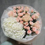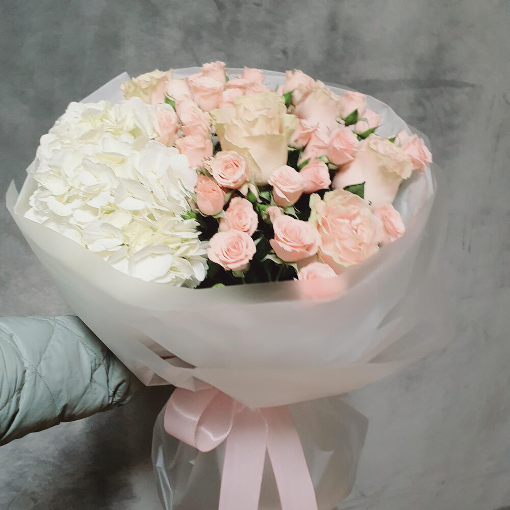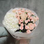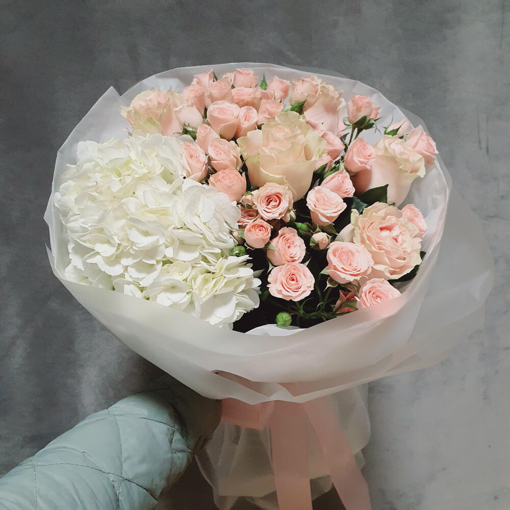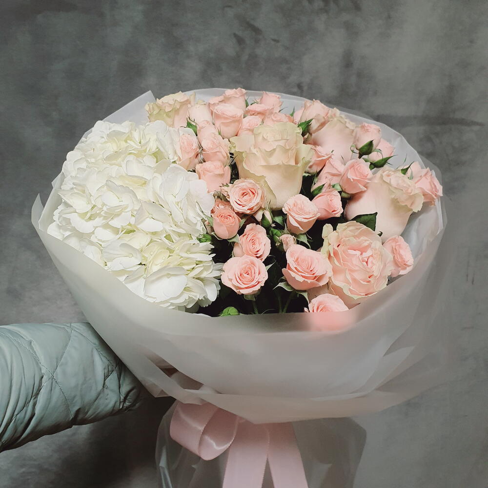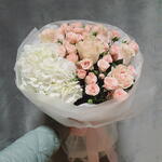 rosas - 5 ud. envoltorio decorativo - 1 ud. hortensia blanca - 1 ud. rosas petiminí - 5 ud.
