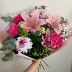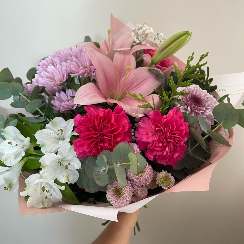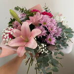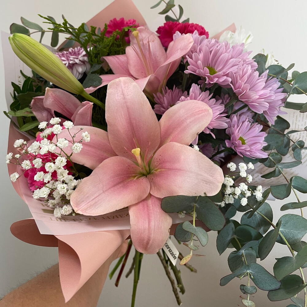 paniculata blanca - 1 ud. margarita rosa - 1 ud. alstroemeria blanca - 1 ud. verde decorativo (follaje) - 1 ud. lirio oriental - 1 ud. crisantemo bicolor - 1 ud. margarita botón rosa - 1 ud. claveles fucsias o rosa claro - 3 ud.