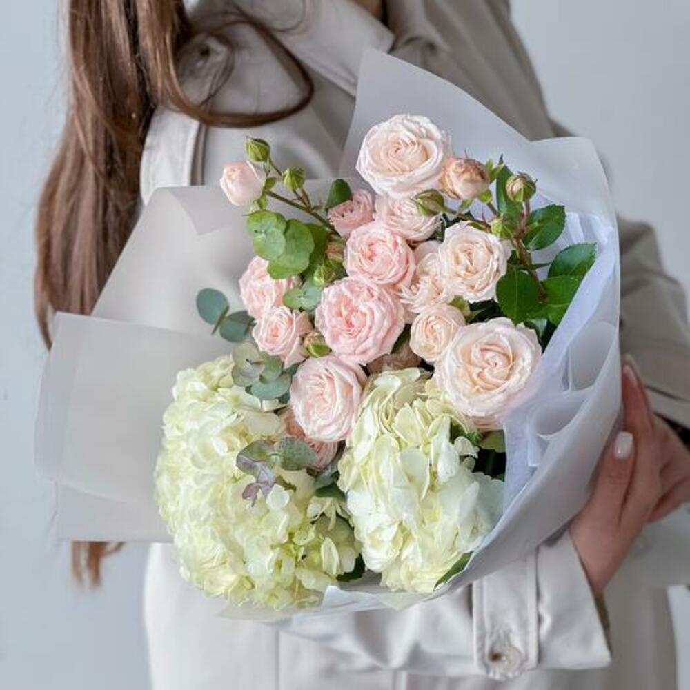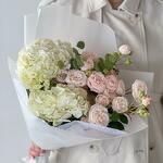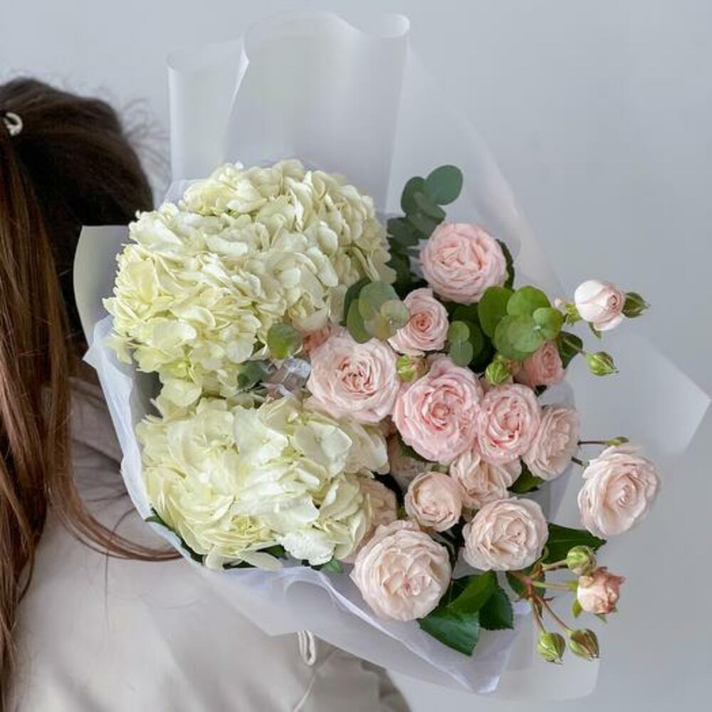 Introducing our elegant bouquet, a harmonious blend of white hydrangeas and delicate blush pink spray roses. This sophisticated arrangement is wrapped in paper, exuding a sense of grace and refinement. Perfect for weddings, anniversaries, or any special occasion, this bouquet brings a touch of timeless elegance to any setting.