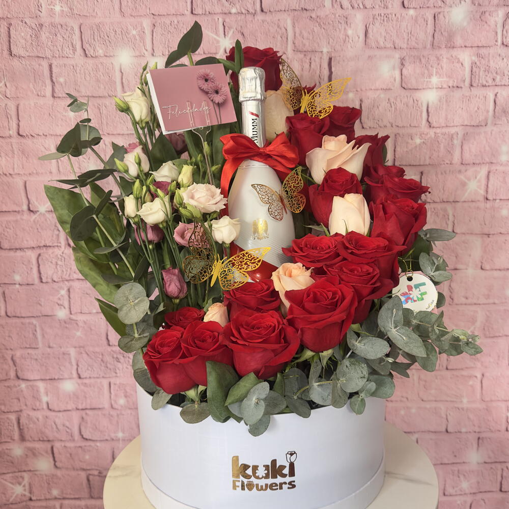 eucalipto - 10 ud. rosas rojas - 20 ud. lazo de cinta - 1 ud. champagne freixenet - 1 ud. tarjeta dedicatoria - 1 ud. mariposas - 2 ud. liciantus lila - 10 ud. contenedor cilíndrico color blanco - 1 ud.