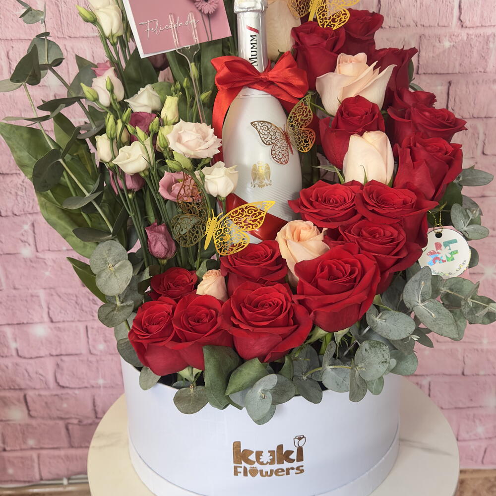 Este producto de la categoría De Autor incluye un espectacular compendio de elementos que deleitarán tus sentidos. Contiene 10 unidades de refrescante eucalipto, acompañadas con una botella de distinguido champagne Freixenet. Se incluye también una tarjeta dedicatoria para personalizar tu mensaje a esa persona especial. El verdadero destaque de este producto son las 20 unidades de rosas rojas, simbolo de pasión y amor, y 10 unidades de Liciantus lila, flores de elegante belleza. Además, cuenta con decoración premium que incluye lazos, mariposas y tarjeteros para realzar la presentación de tu obsequio. Todo esto se presenta de manera impecable en un contenedor cilíndrico de color blanco. Un regalo perfecto para cualquier ocasión.