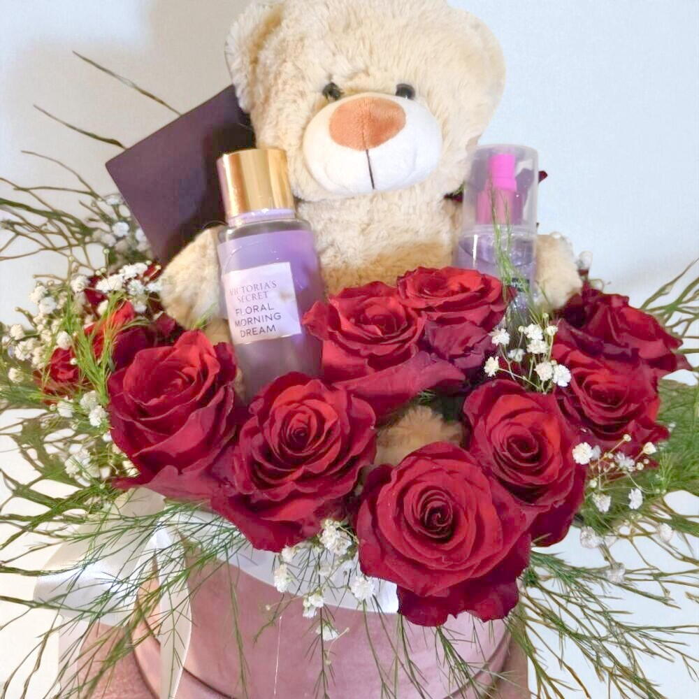 Este encantador arreglo es el regalo perfecto para sorprender con ternura y elegancia. Compuesto por rosas rojas intensas que transmiten pasión y amor, acompañado de un adorable oso de peluche que añade un toque de dulzura irresistible. Como complemento especial, incluye productos de cuidado personal de Victoria’s Secret, que elevan aún más el nivel de detalle y sofisticación. Todo viene presentado en una elegante base aterciopelada, decorada con follaje delicado y gypsophilas blancas que realzan la frescura del conjunto. Ideal para ocasiones románticas, cumpleaños o simplemente para consentir a alguien muy especial. Este regalo combina flores, fragancias y cariño en una sola experiencia inolvidable. ¡Una sorpresa que enamora todos los sentidos!