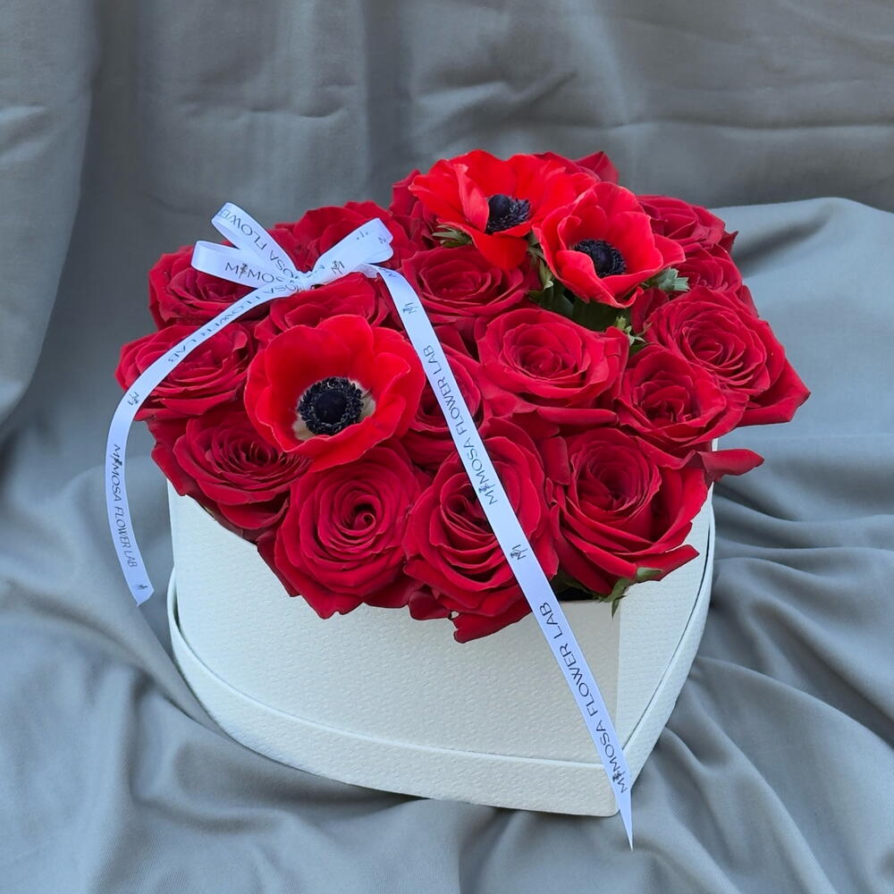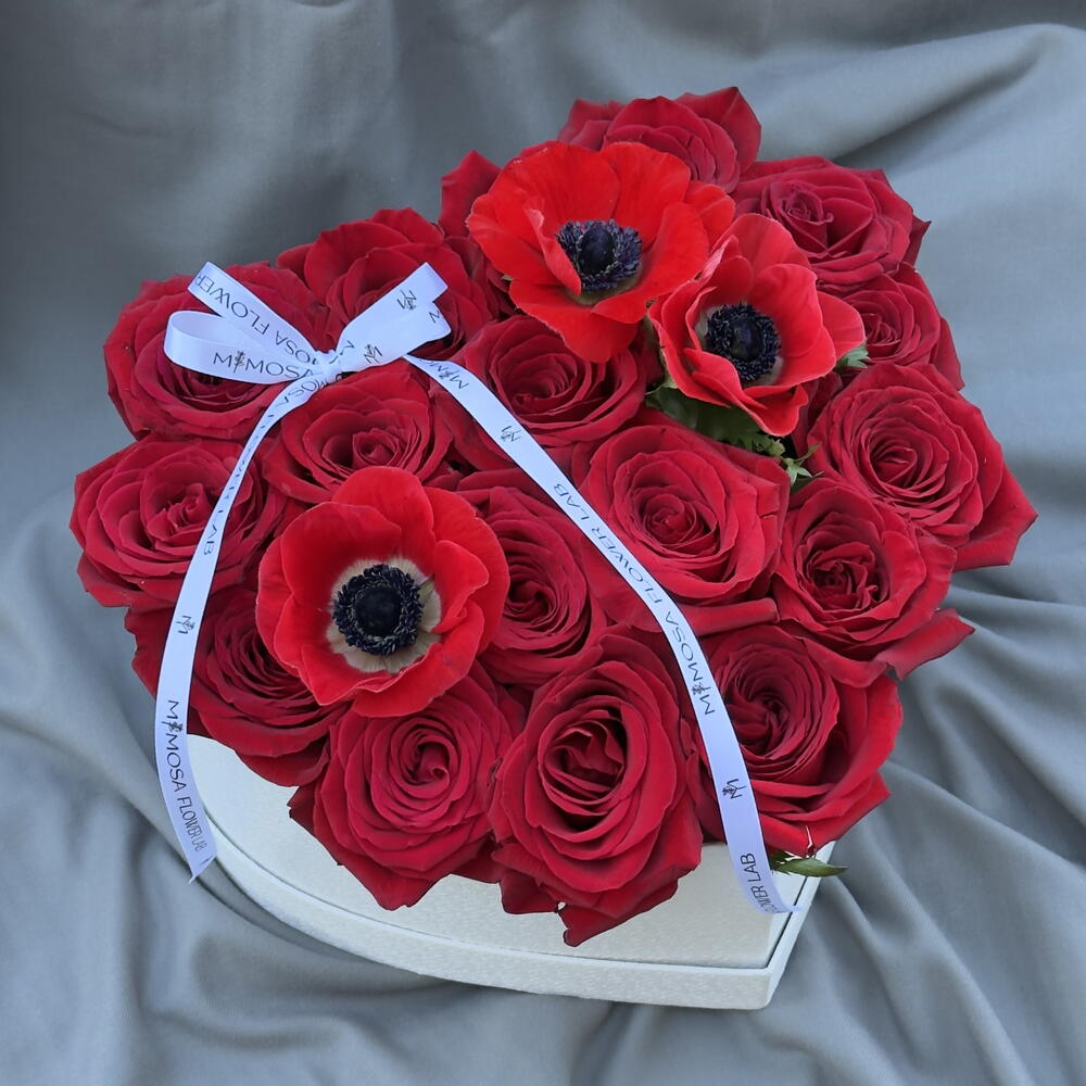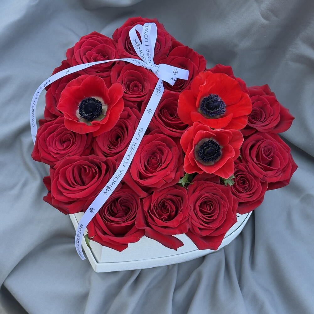 box heart - 1 ud. ribbon satin - 1 ud. anémonas - 3 ud. rosa freedom - 17 ud.