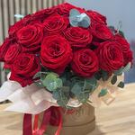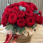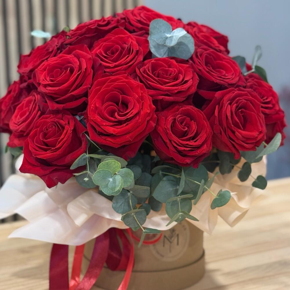 Este precioso conjunto de flores incluye lujosas rosas Freedom, elegantemente dispuestas en una sombrerera con estilo. La composición se completa con tres cintas de raso, que aportan un acento refinado y completan la imagen. Un regalo ideal que puede transmitir un sutil juego de sentimientos y emociones brillantes.
