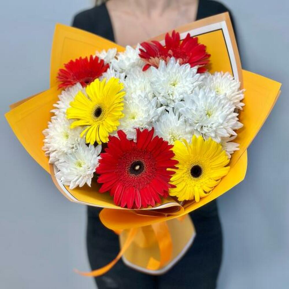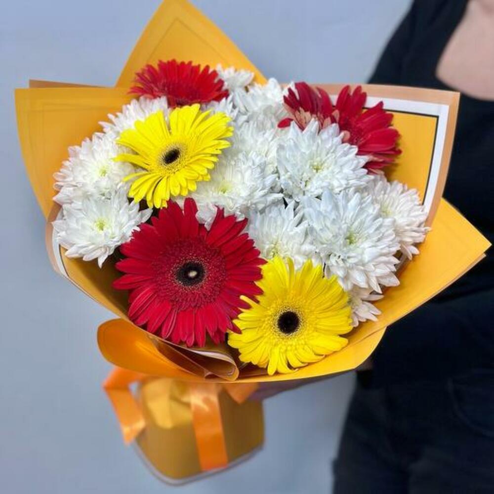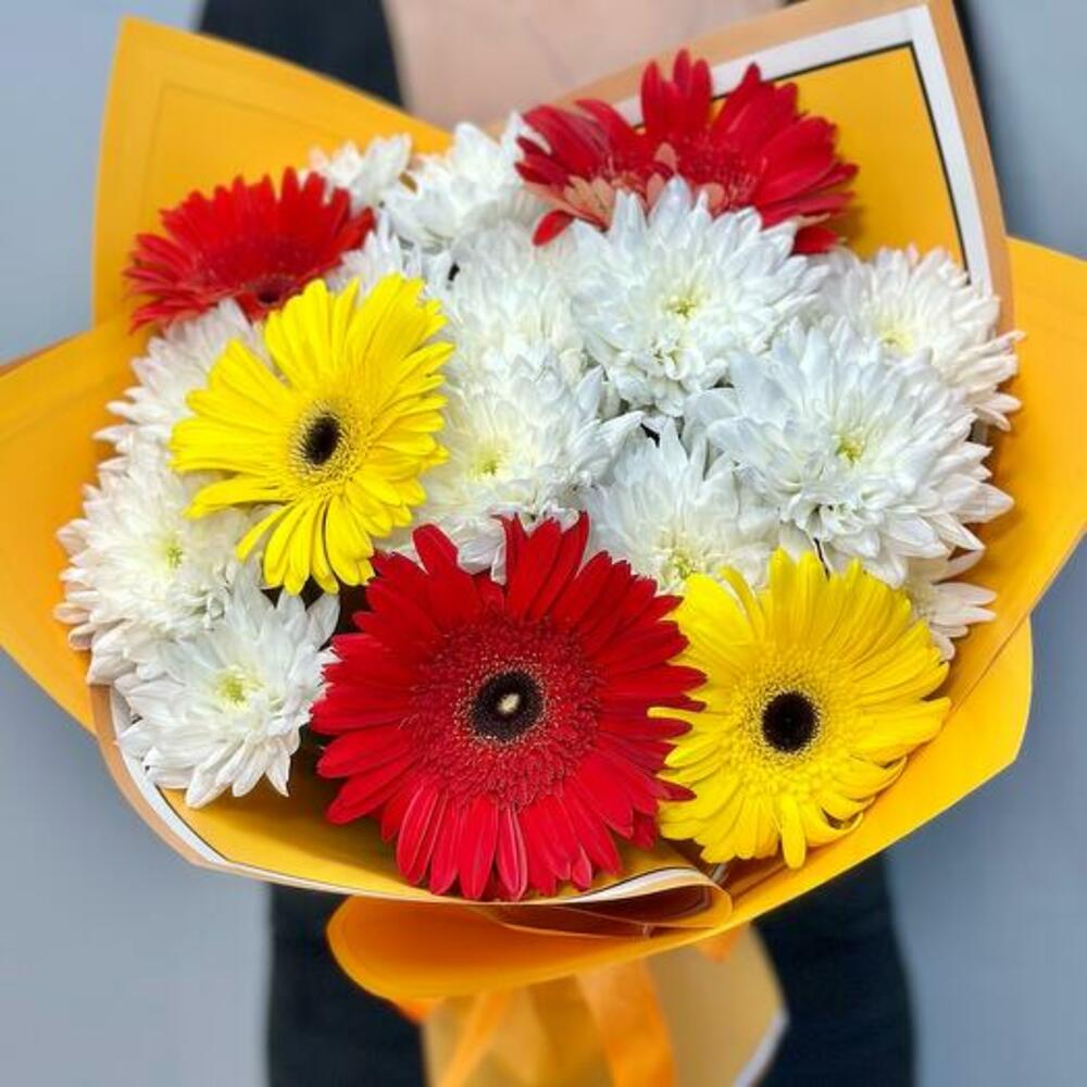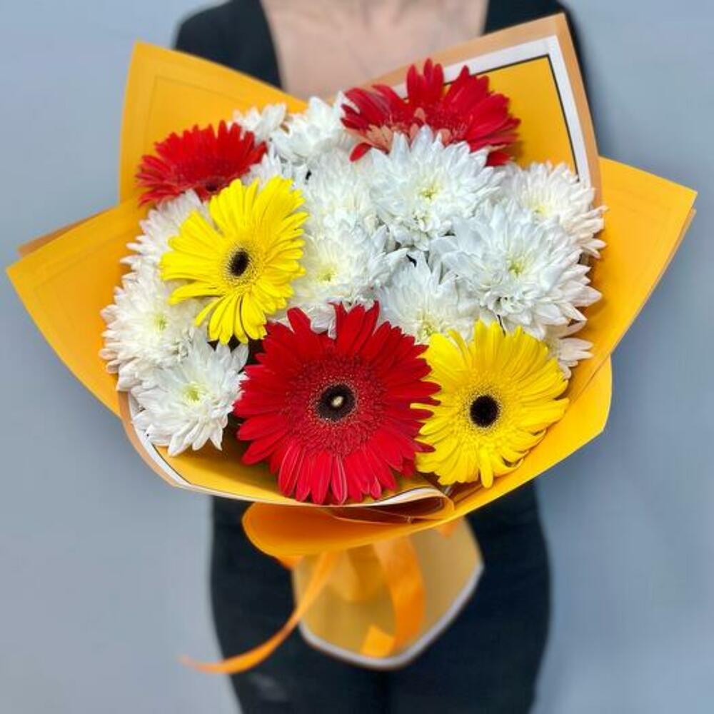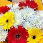 Illuminate any occasion with our vibrant Bright Harmony Bouquet, featuring a delightful mix of pristine white chrysanthemums, bold red gerberas, and sunny yellow gerberas. This eye-catching arrangement combines the purity and elegance of chrysanthemums with the cheerful, radiant hues of gerberas, creating a bouquet that exudes joy and warmth. Perfect for birthdays, celebrations, or simply to brighten someones day, this bouquet is expertly wrapped in stylish paper and tied with a coordinating ribbon. Make a lasting impression with this stunning blend of colors and blooms.