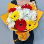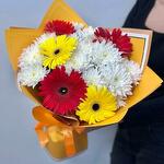 Gerbera - 5 ud. Wrapping - 1 ud. white bush chrysanthemum - 3 ud.