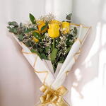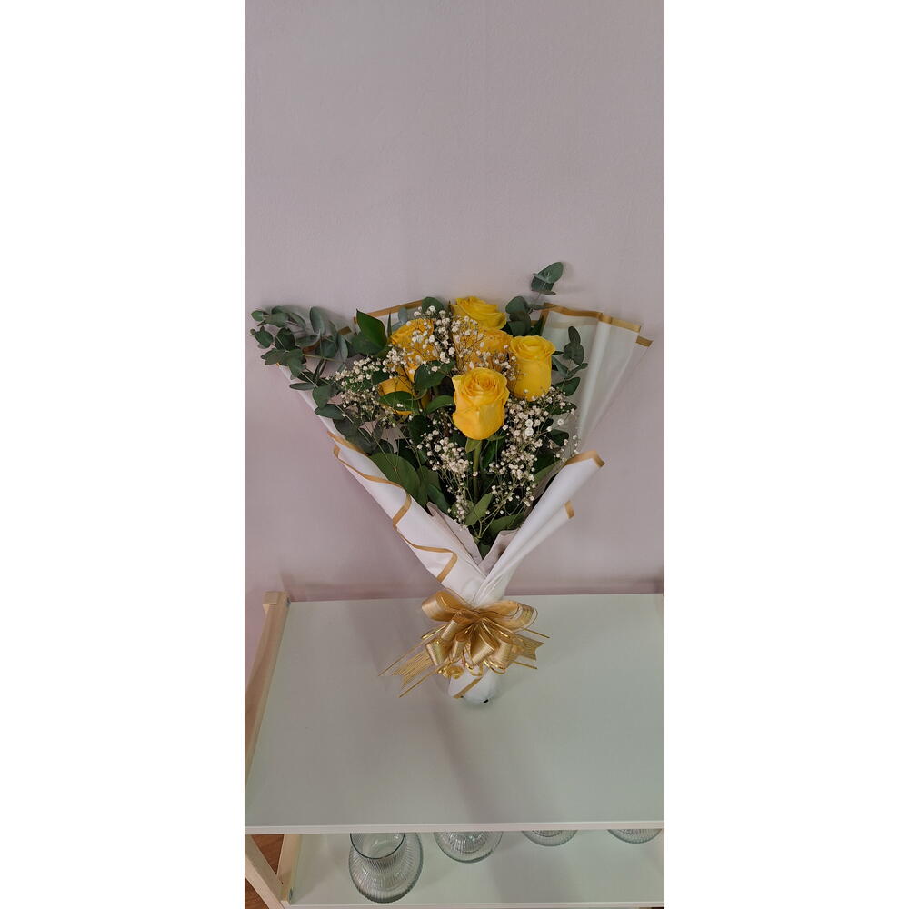 Este radiante ramo de rosas amarillas representa la alegría, la amistad y los nuevos comienzos. Acompañado por delicadas ramas de gypsophila y eucalipto fresco, este diseño captura la esencia de la felicidad y la frescura. Envuelto en papel blanco con elegantes bordes dorados y un lazo a juego, es perfecto para cumpleaños, celebraciones o para iluminar el día de alguien especial. Este ramo es un símbolo vibrante de buenos deseos y positividad.