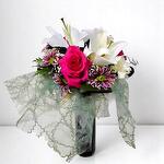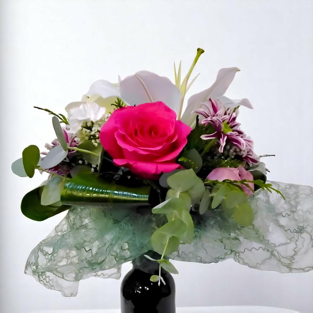 El ramo Brillo de Romance es una delicada combinación de lirios blancos, rosas fucsias y crisantemos bicolores que crean un contraste vibrante y lleno de encanto. Su diseño elegante, realzado con detalles de encaje, lo convierte en el regalo perfecto para expresar admiración y cariño.