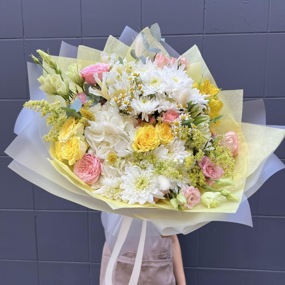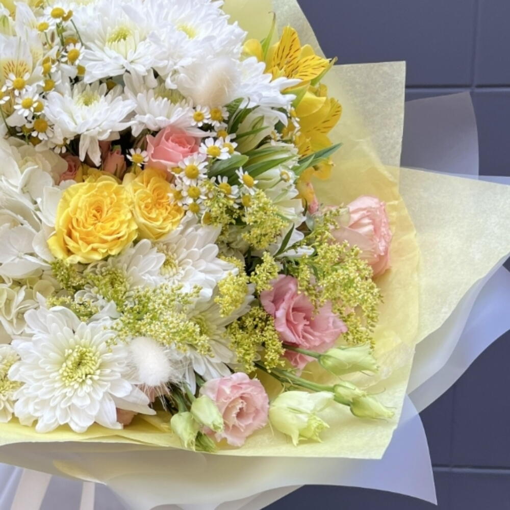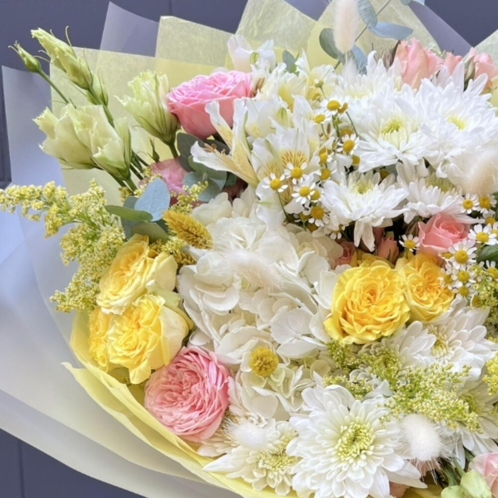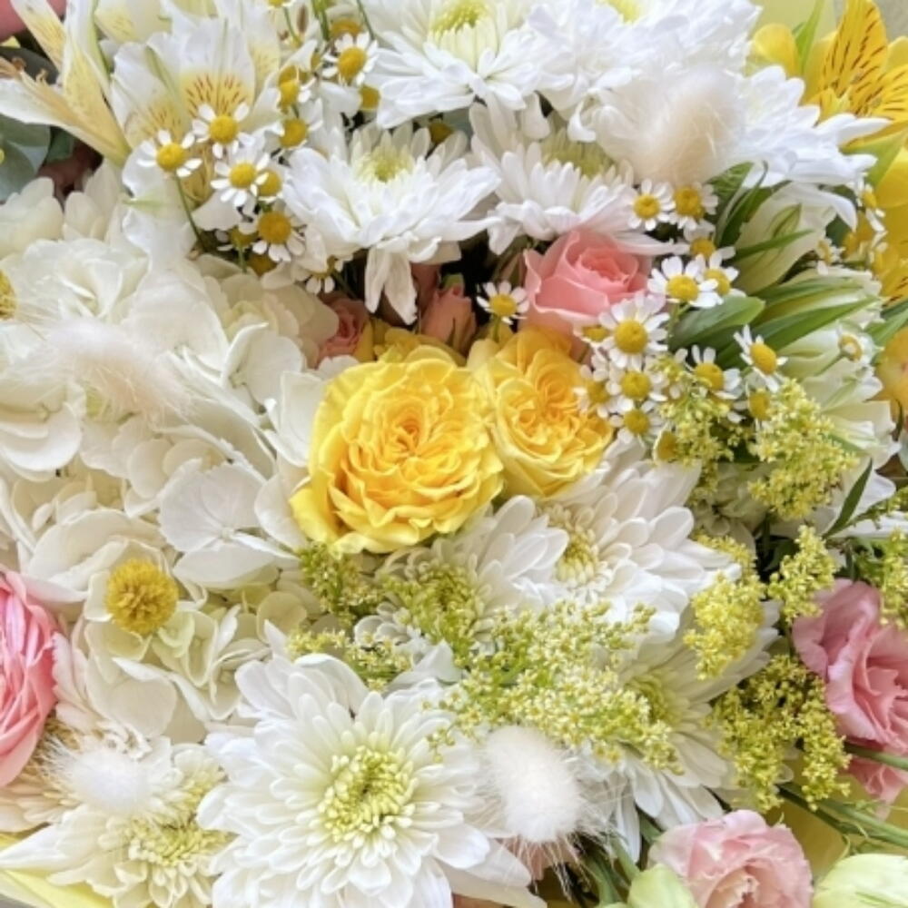 Alstroemeria - 4 ud. Solidago - 3 ud. hortensia - 7 ud. Lisianthus - 8 ud. rosa - 5 ud. hrizantema - 6 ud. manzanilla - 4 ud.