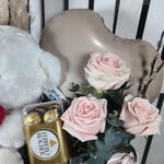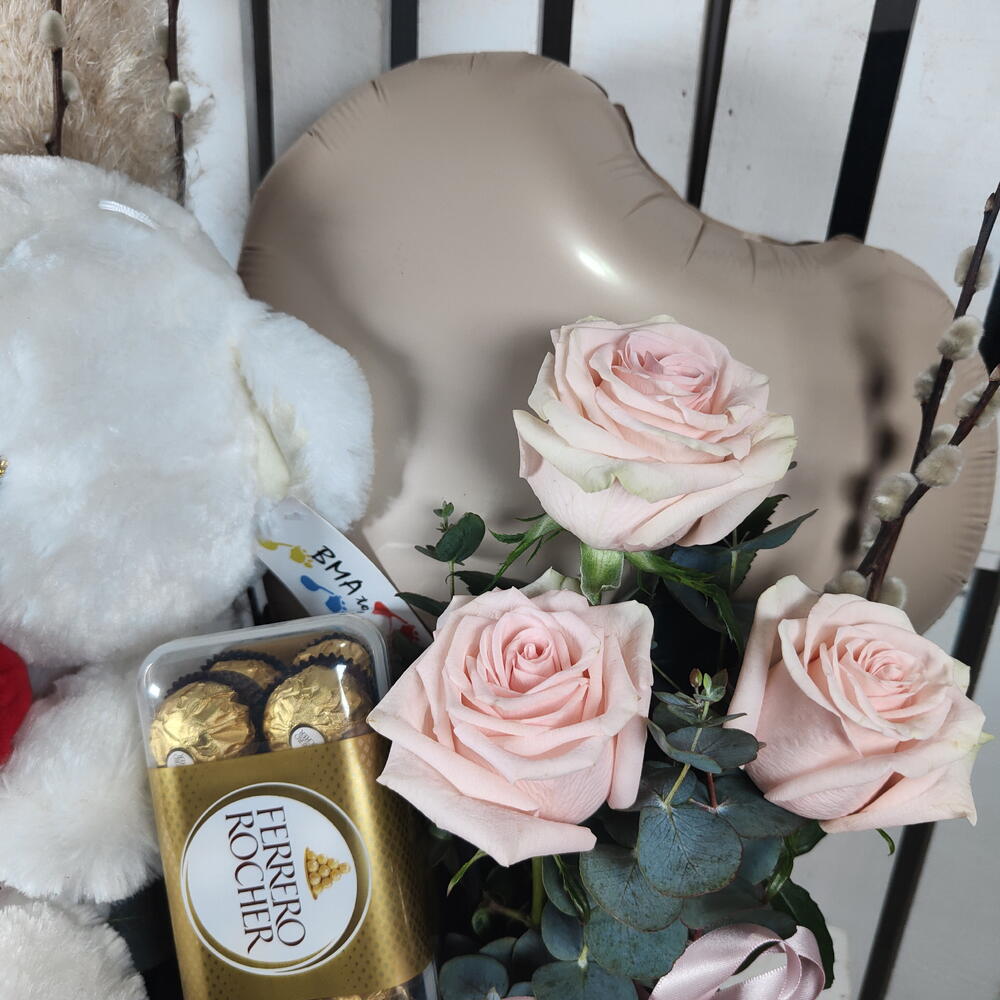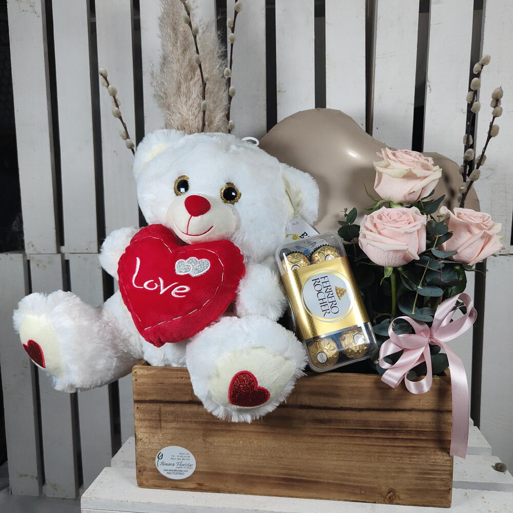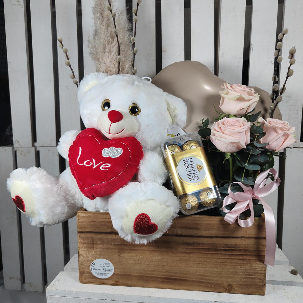 eucalipto - 5 ud. salix - 5 ud. rosas ecuador - 3 ud. esponja floral - 2 ud. caja madera - 1 ud. bombones ferrero rocher - 1 ud. peluche oso - 1 ud. plumero - 1 ud. globo corazon - 1 ud.