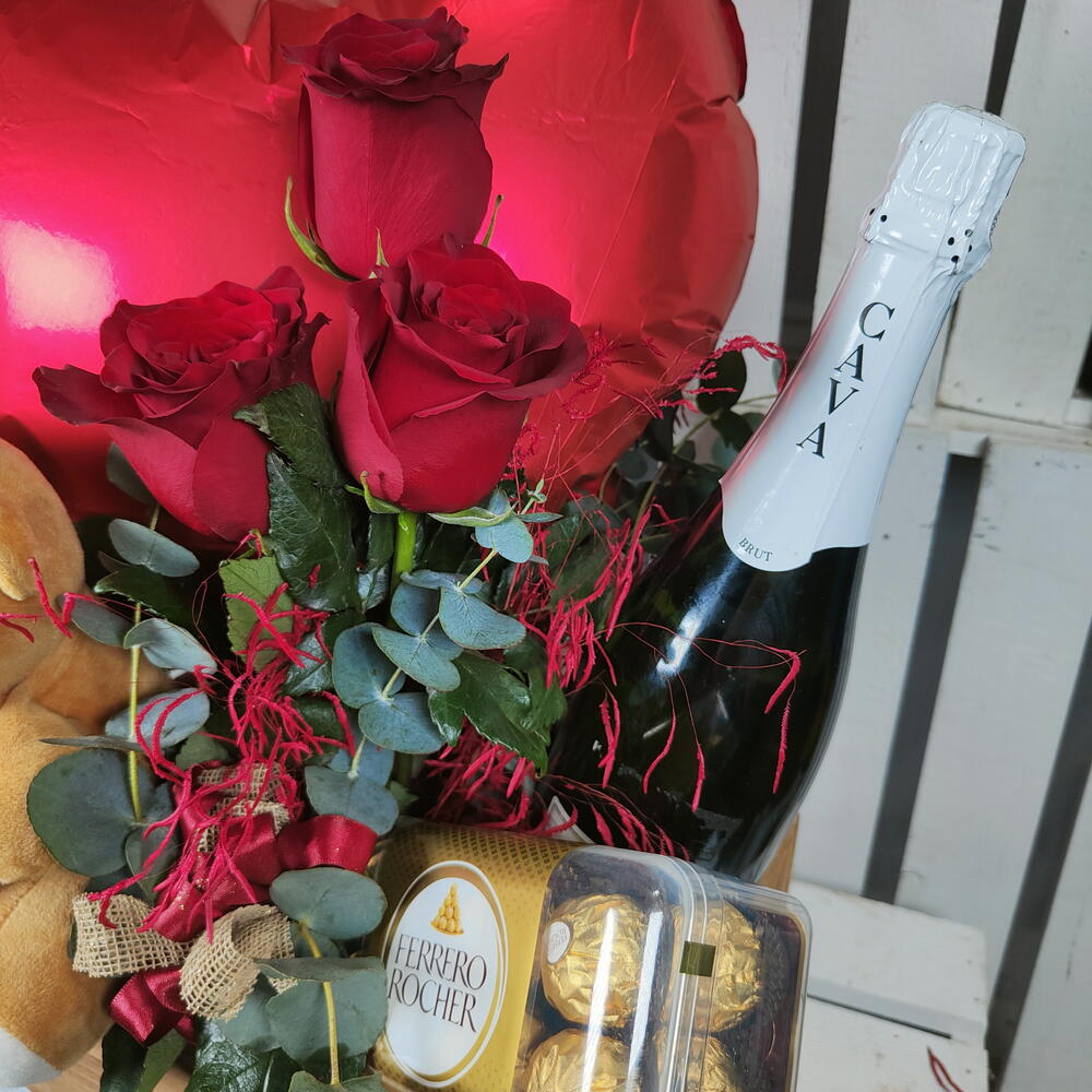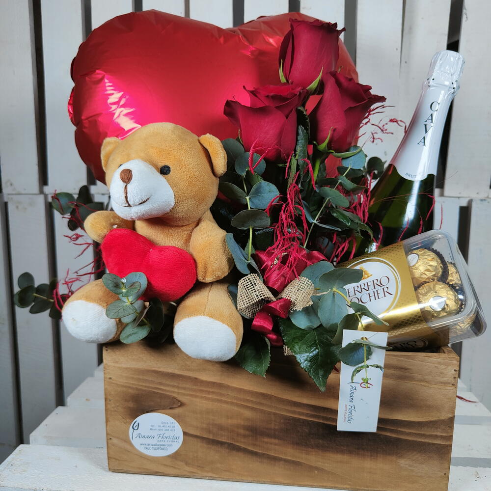 eucalipto - 5 ud. caja de madera - 1 ud. rosas ecuador - 3 ud. esponja floral - 3 ud. cava - 1 ud. peluche osito - 1 ud. globo corazon - 1 ud. bombones(puede variar según temporada) - 1 ud.