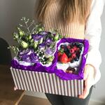 Un regalo que combina elegancia, frescura y dulzura. Este arreglo presenta flores en tonos morados vibrantes que aportan un toque romántico, acompañadas de frutas frescas como fresas, arándanos y frambuesas, así como deliciosos chocolates Kinder y bombones Raffaello. Ideal para sorprender en cumpleaños, aniversarios o simplemente para expresar cariño de una forma original y sofisticada. Las flores están dispuestas en una elegante caja con papel decorativo en morado y blanco, creando un contraste llamativo. Para mantener el arreglo en perfecto estado, se recomienda mantener las flores en un lugar fresco, lejos de la luz solar directa, y consumir las frutas lo antes posible para disfrutar de su frescura. Un detalle que enamora todos los sentidos.