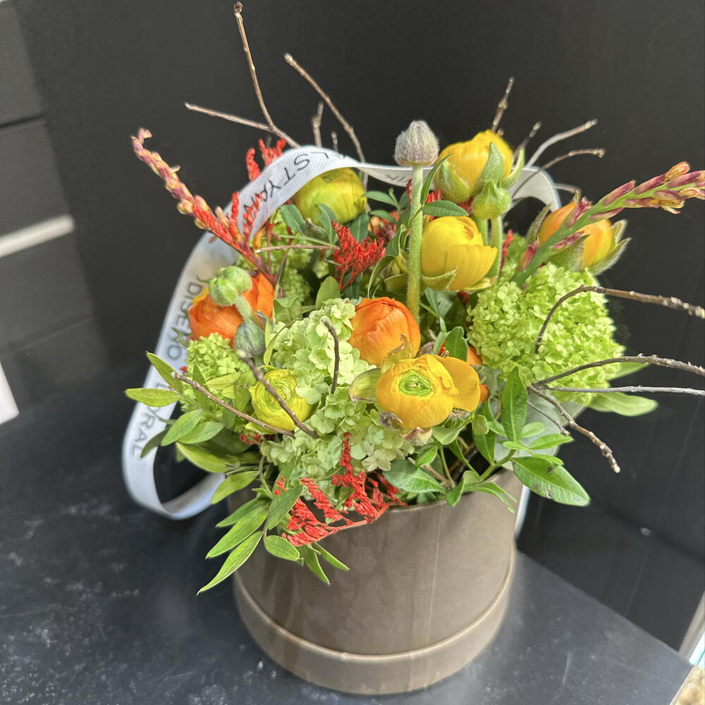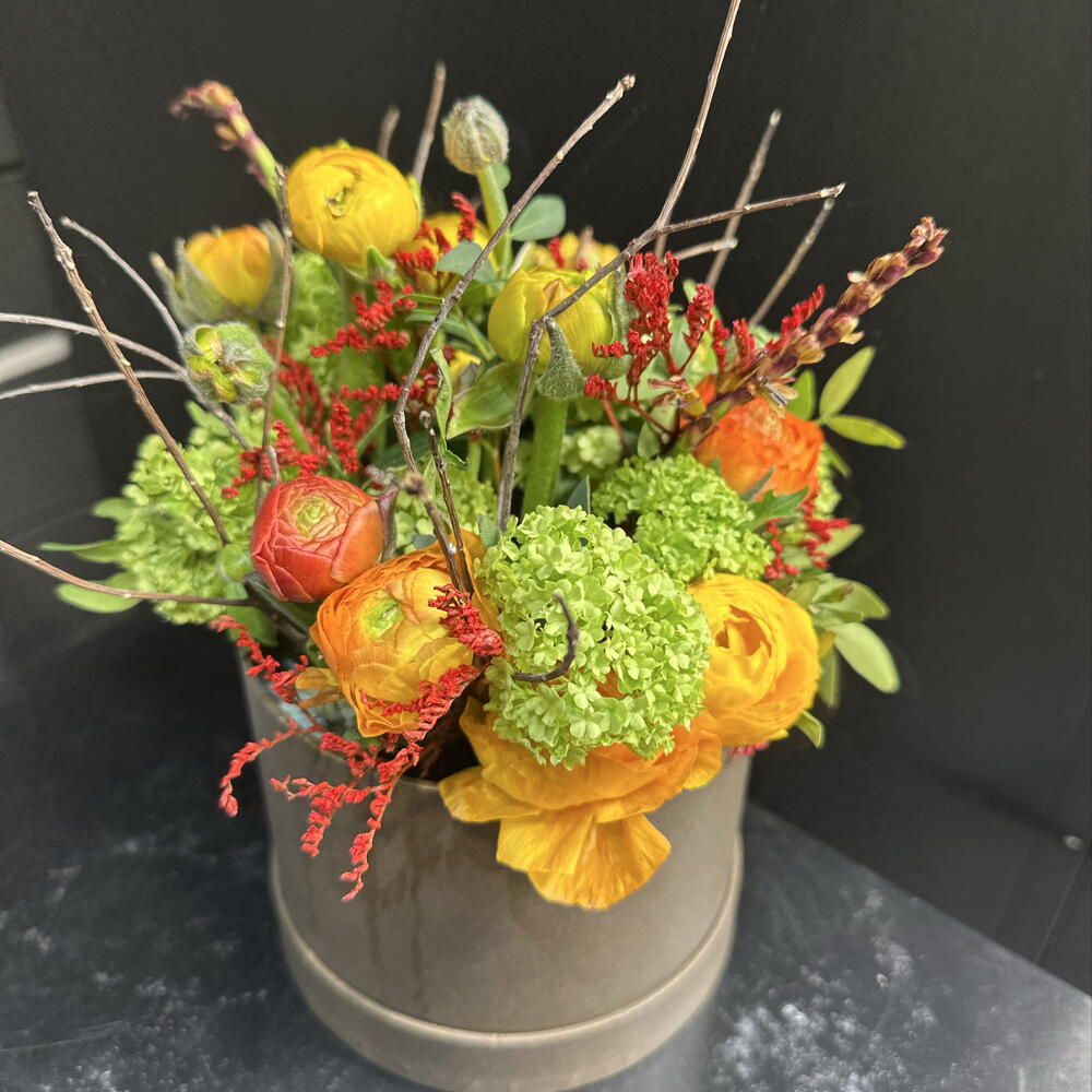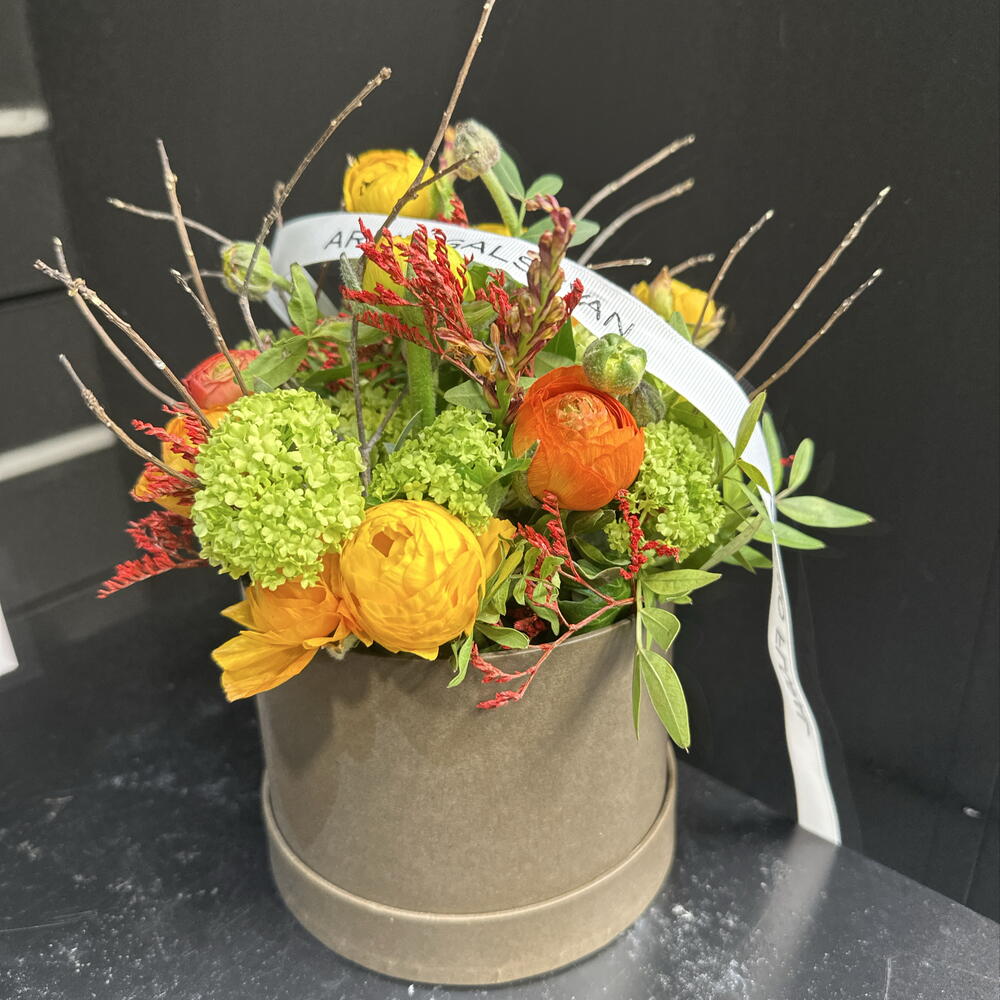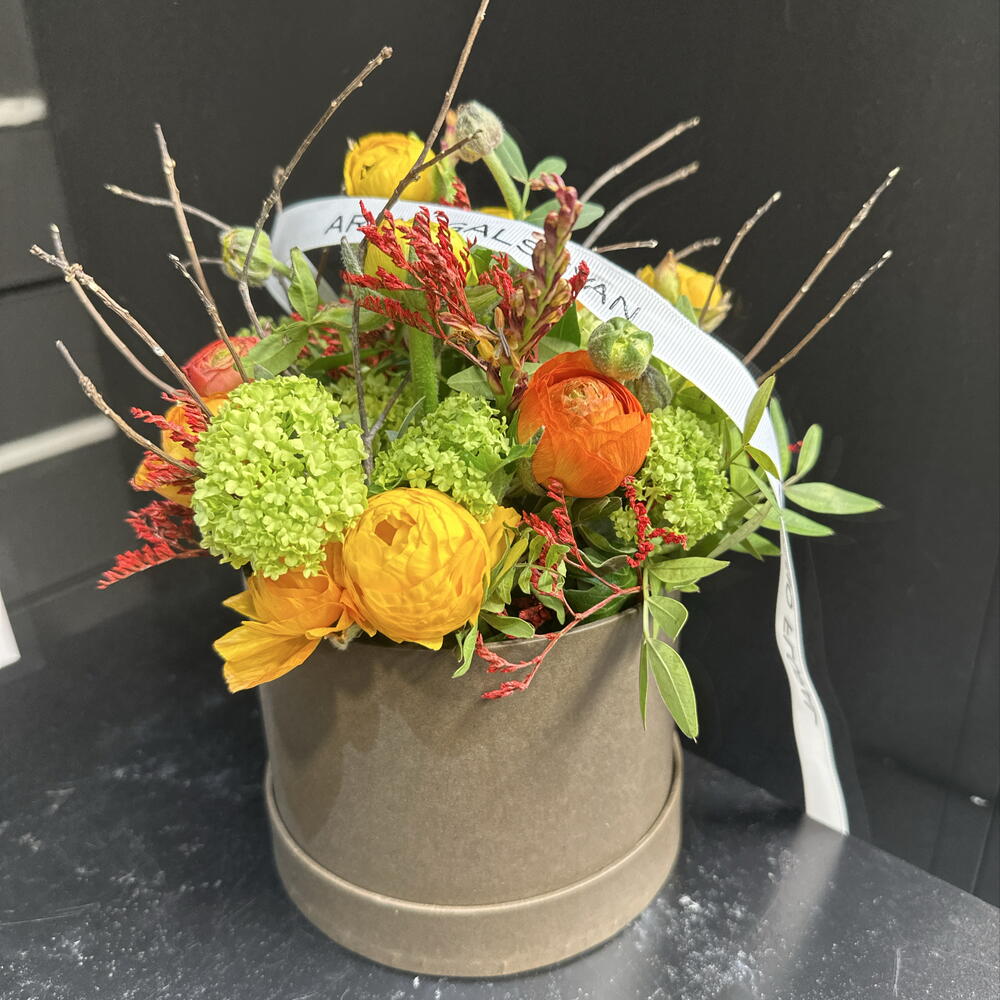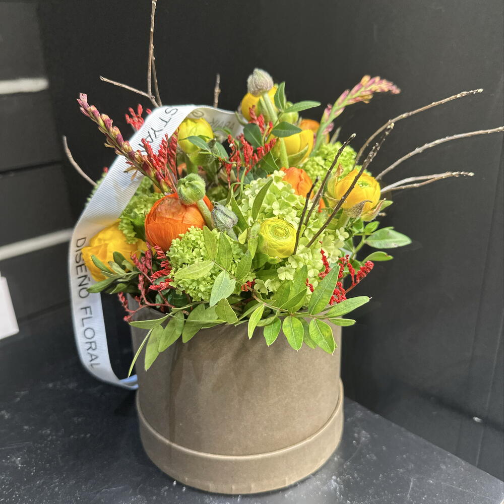 Limonium - 1 ud. ranunculus - 9 ud. caja - 1 ud. viburno verde - 2 ud.