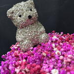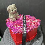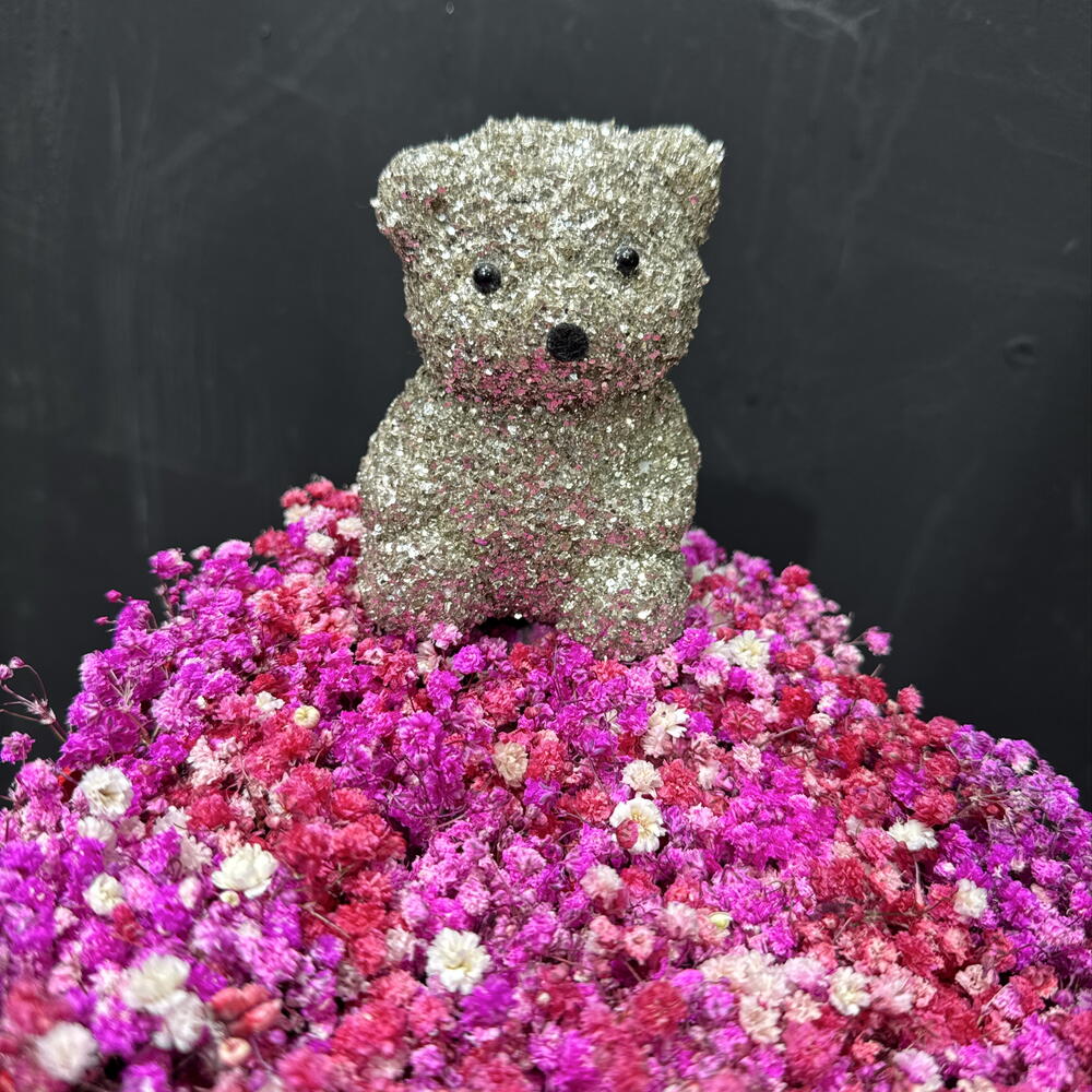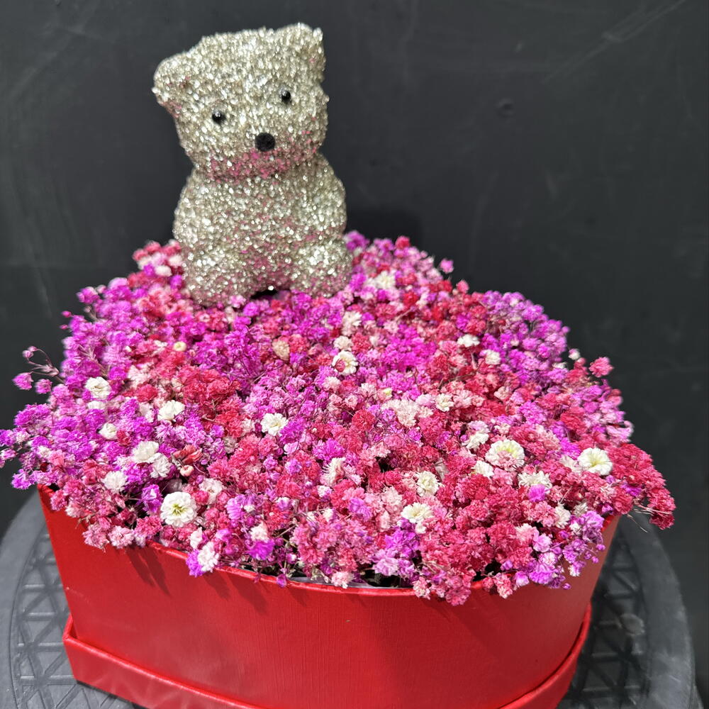 En esta caja en forma de corazón guardo un pequeño pedacito de todo lo que siento por ti. El osito representa el cariño que siempre quiero darte, y las paniculatas, tan delicadas, reflejan la dulzura y la calma que traes a mi vida