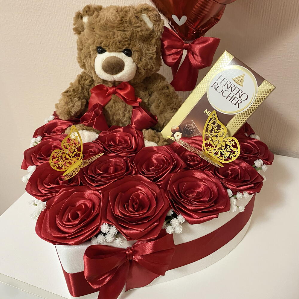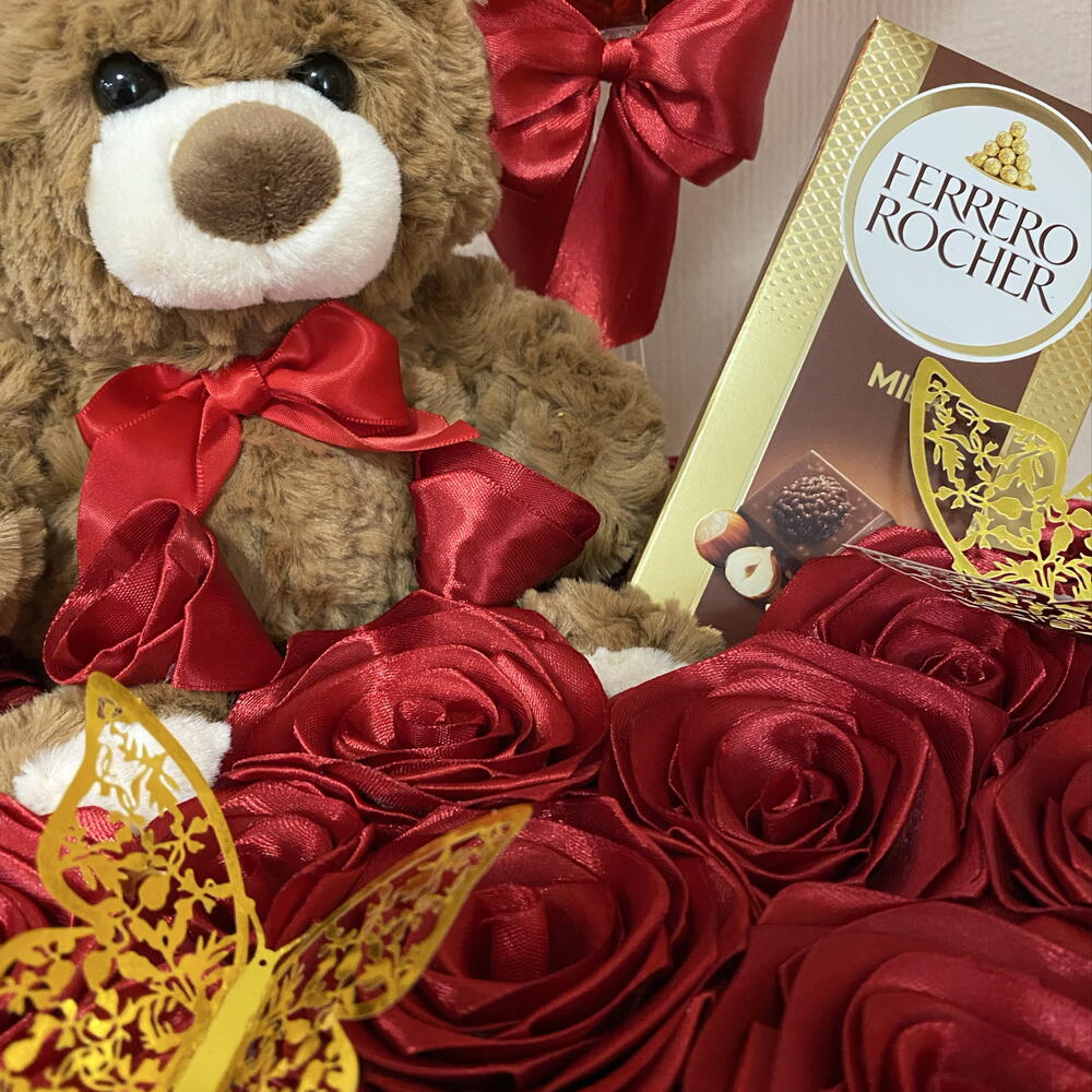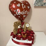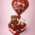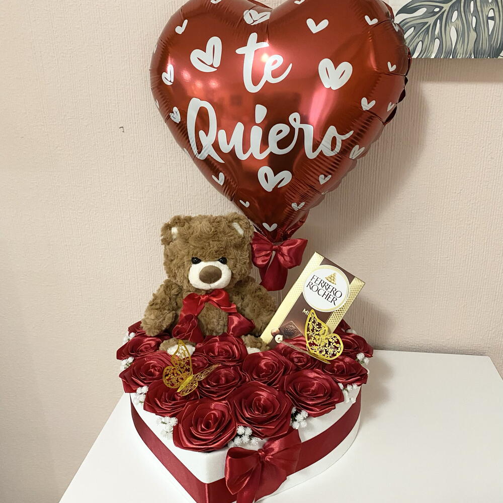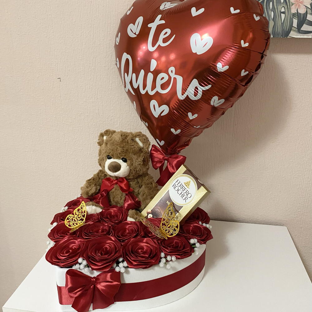 Mariposa decorative - 2 ud. globo te quiero - 1 ud. caja corazón decorativa - 1 ud. ferrero rocher chocolate con leche 90g - 1 ud. pequeñas flores artificiales blancas - 11 ud. osito de peluche suave marrón - 1 ud. rosas eternas rojos - 20 ud.