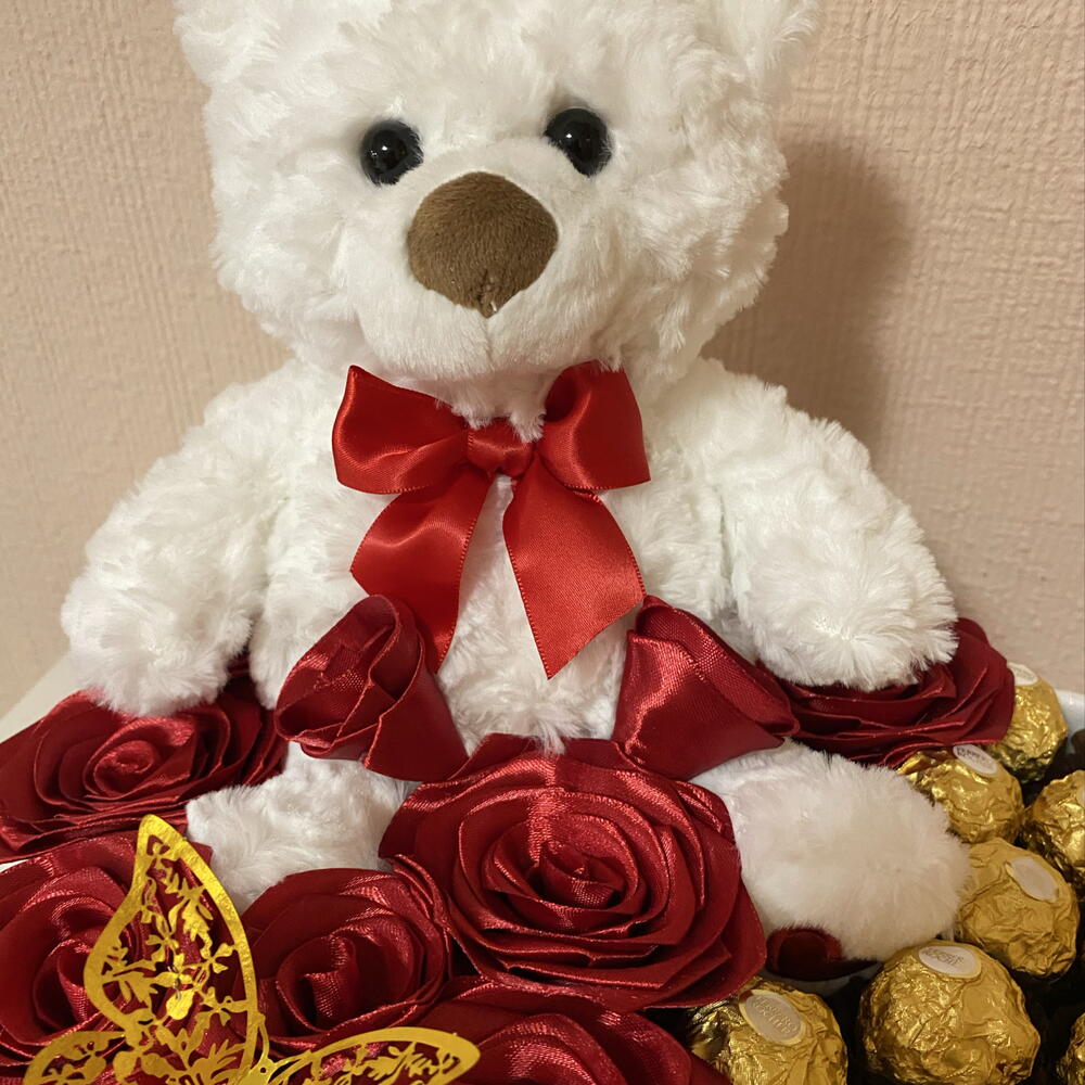 Ferrero rocher - 19 ud. mariposa decorativa - 1 ud. rosas eternas - 11 ud. caja corazón decorativa - 1 ud. osito de peluche suave blanco - 1 ud.
