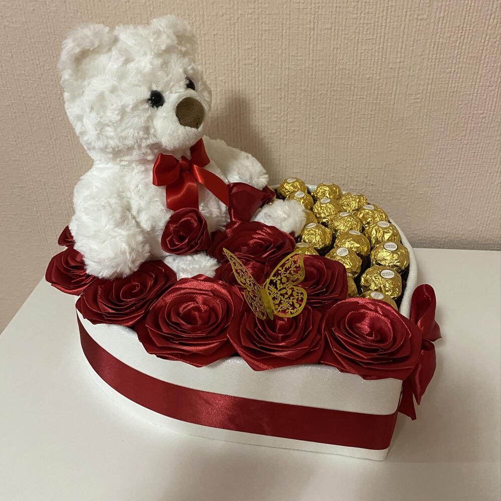 Caja corazon elegante con osito blanco, rosas y Ferrero - regalo premium para aniversario, cumpleanos y Dia de la Madre