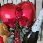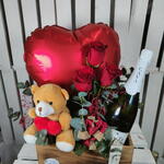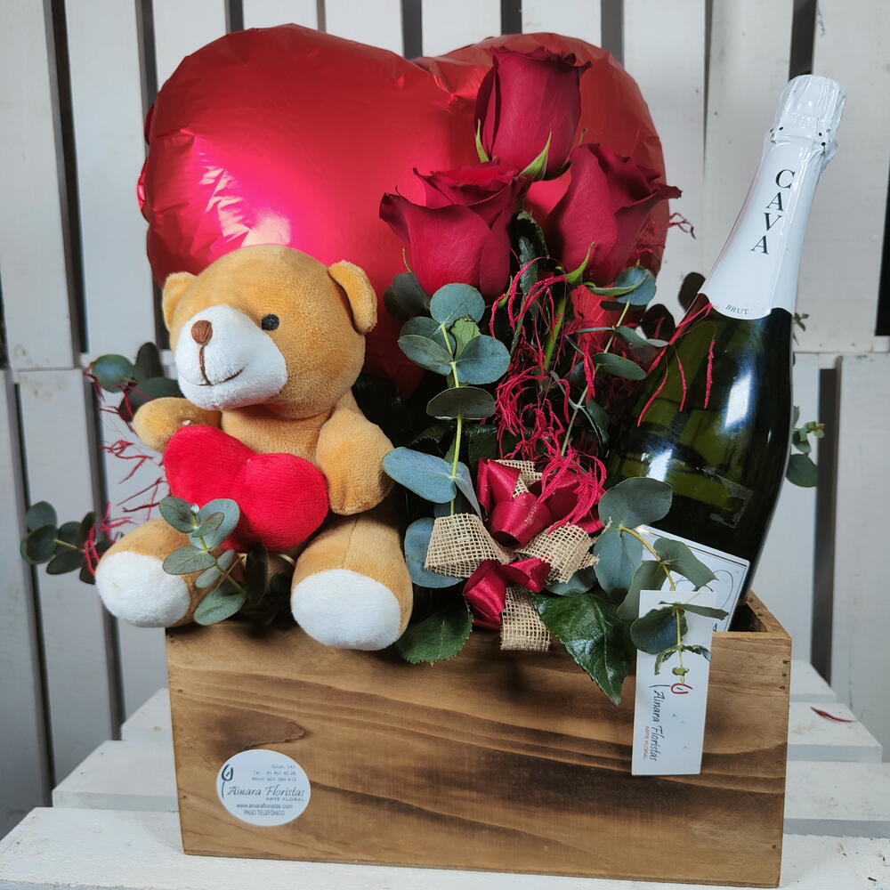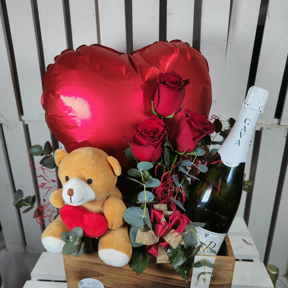 eucalipto - 5 ud. caja de madera - 1 ud. rosas ecuador - 3 ud. esponja floral - 2 ud. cava - 1 ud. peluche osito - 1 ud. globo corazón - 1 ud.