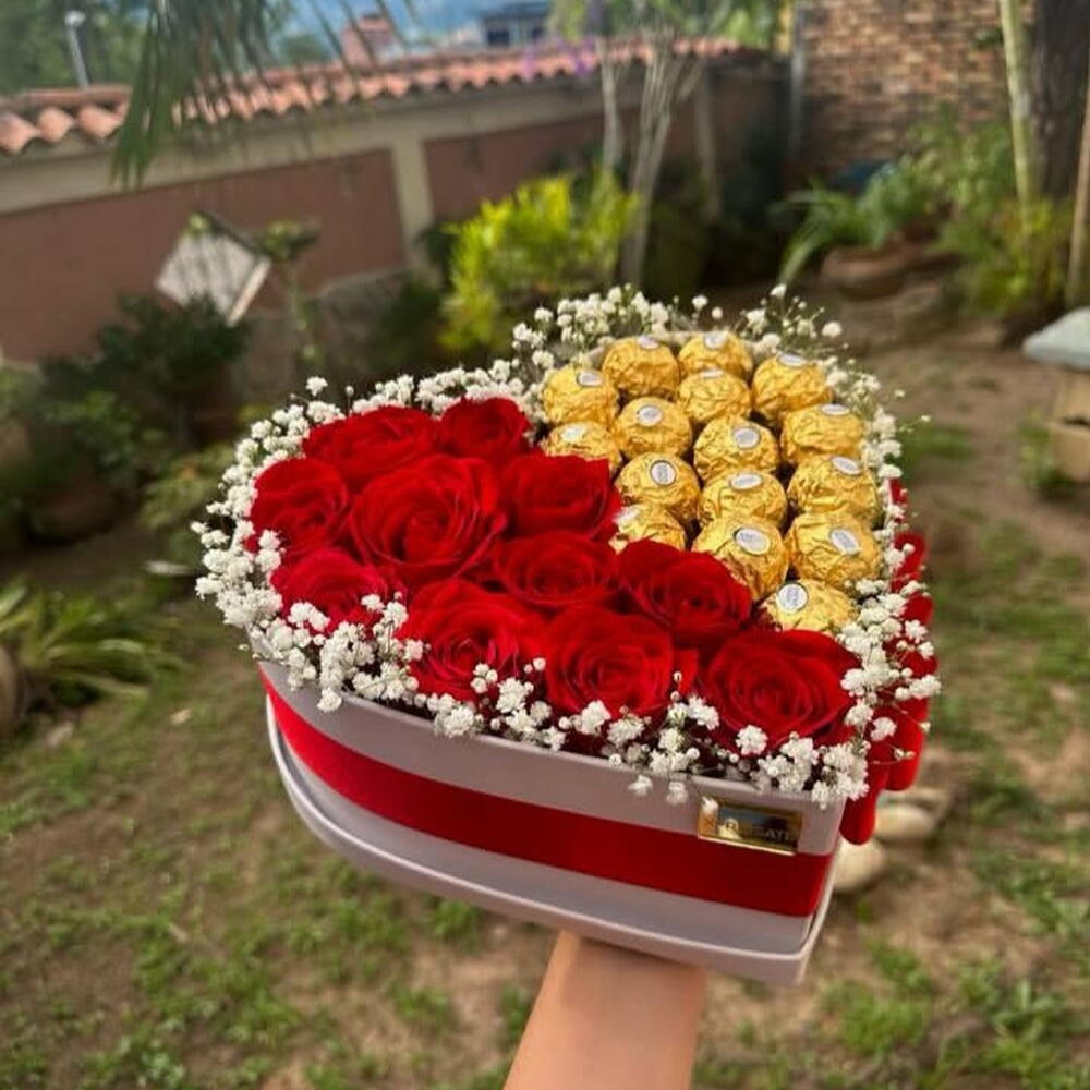 Caja de corazon con rosas y ferreros