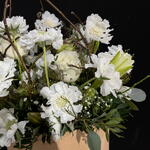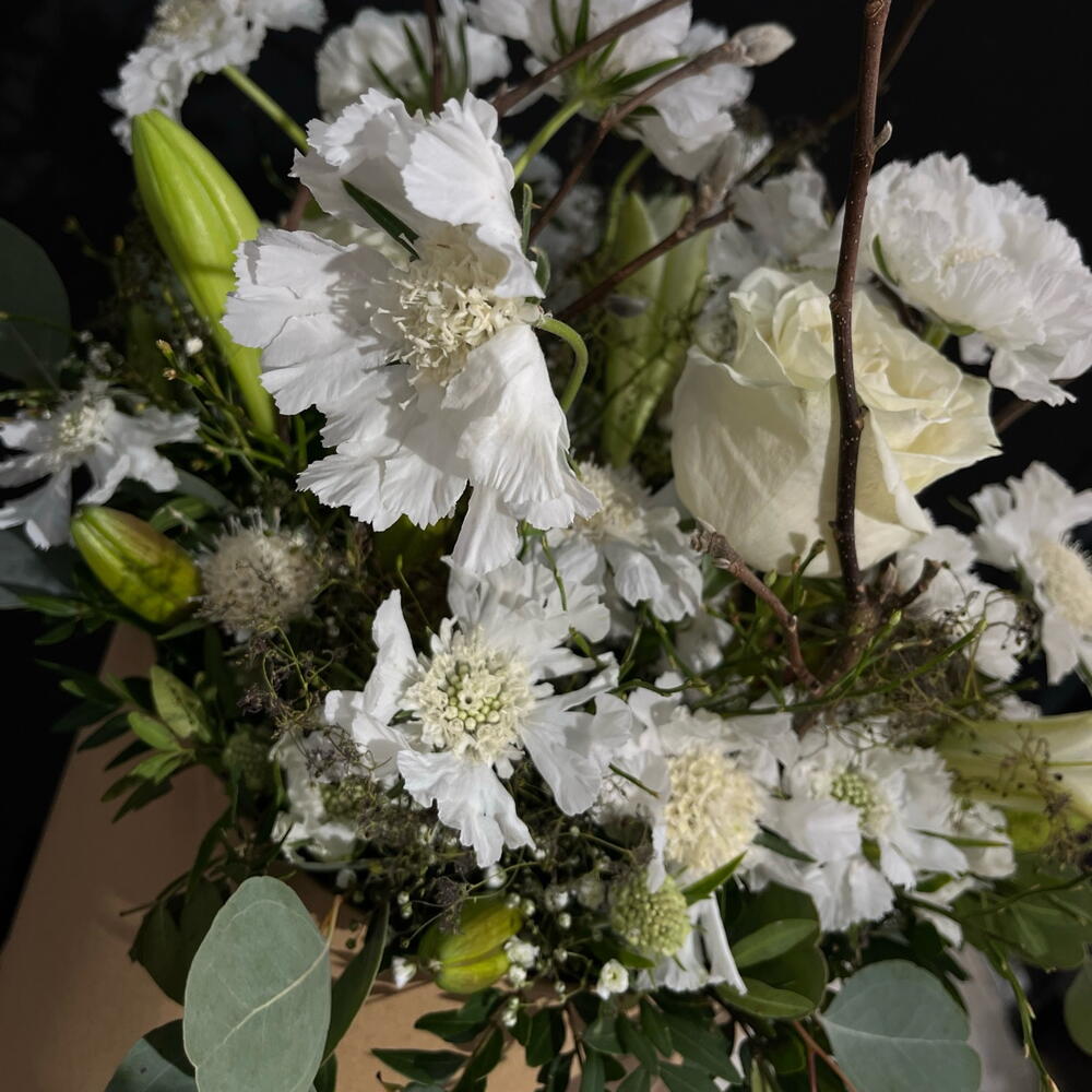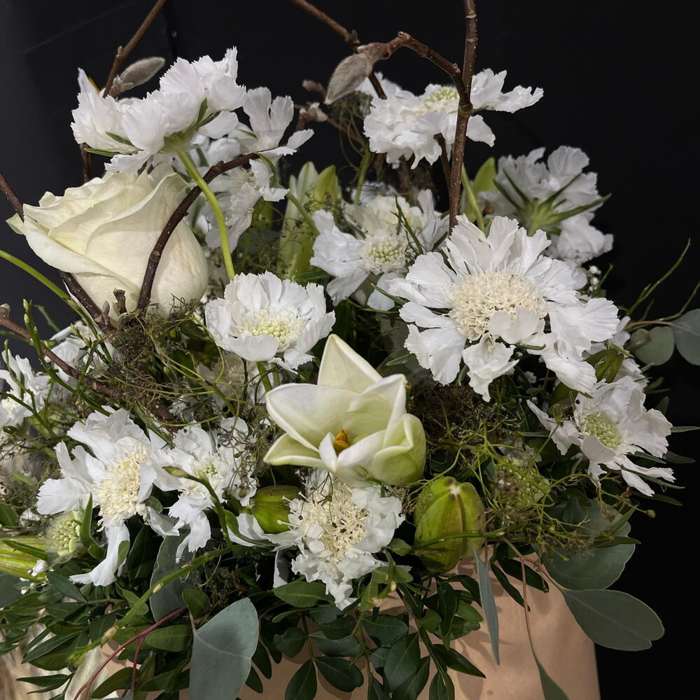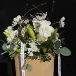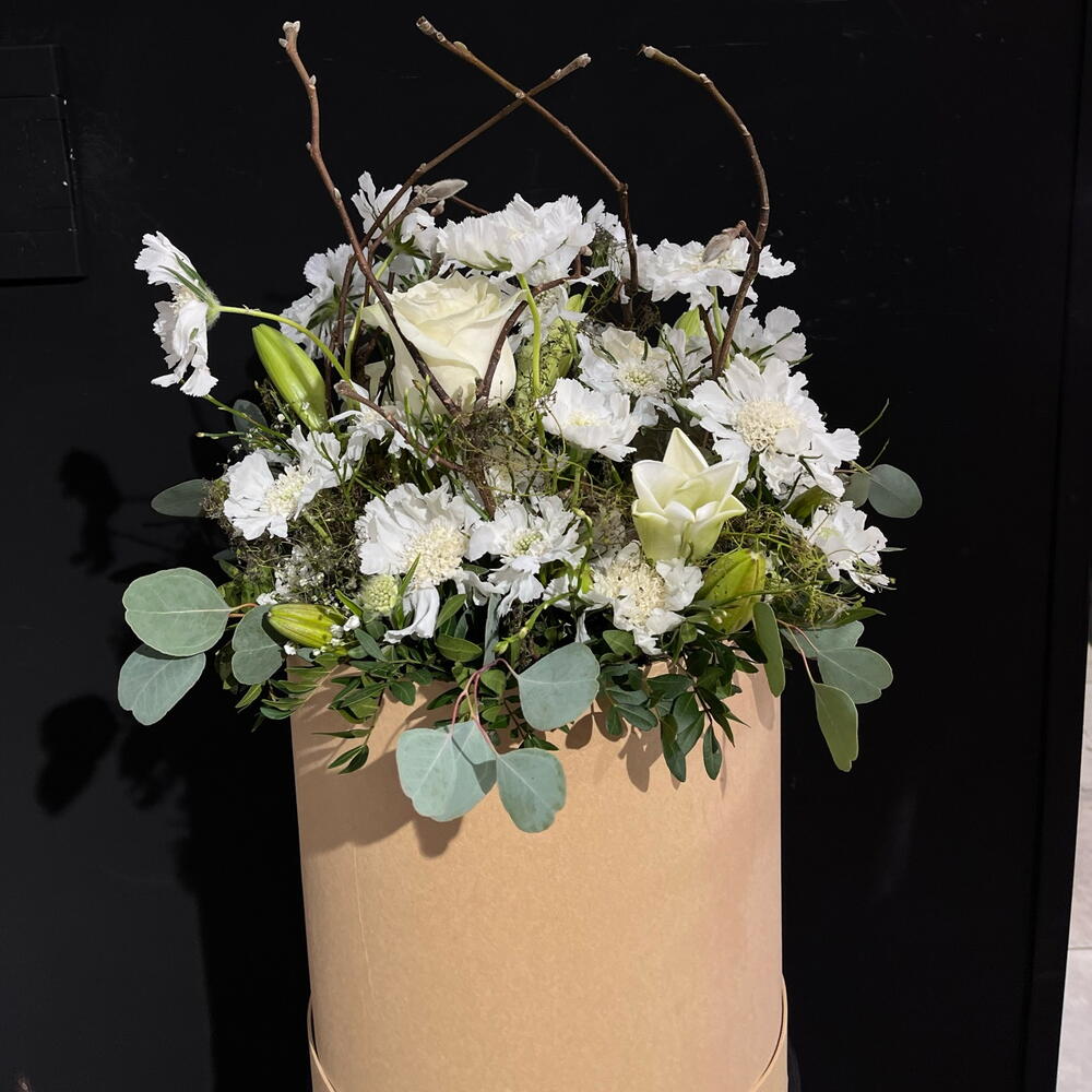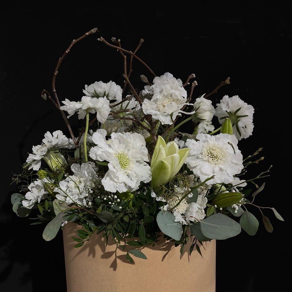 Lilium - 1 ud. Pistachio - 3 ud. rosas - 2 ud. eucalipto populus - 1 ud. escabiosa - 20 ud. rama de magnolia - 3 ud. vbox caja de papel - 1 ud.
