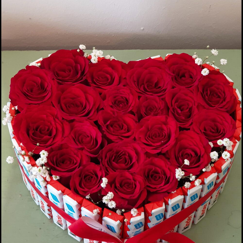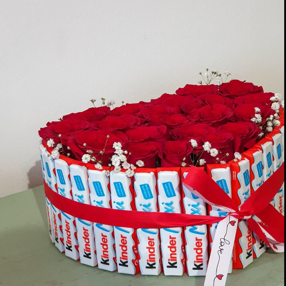 rosas rojas - 18 ud. chocolate kinder bueno - 24 ud. cinta decorativa roja - 1 ud. paniculata gypsophila (flor blanca) - 1 ud.