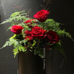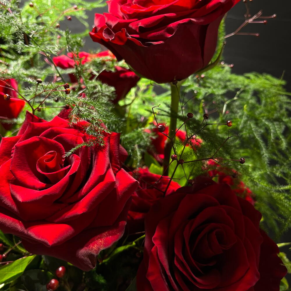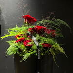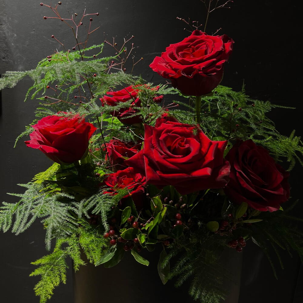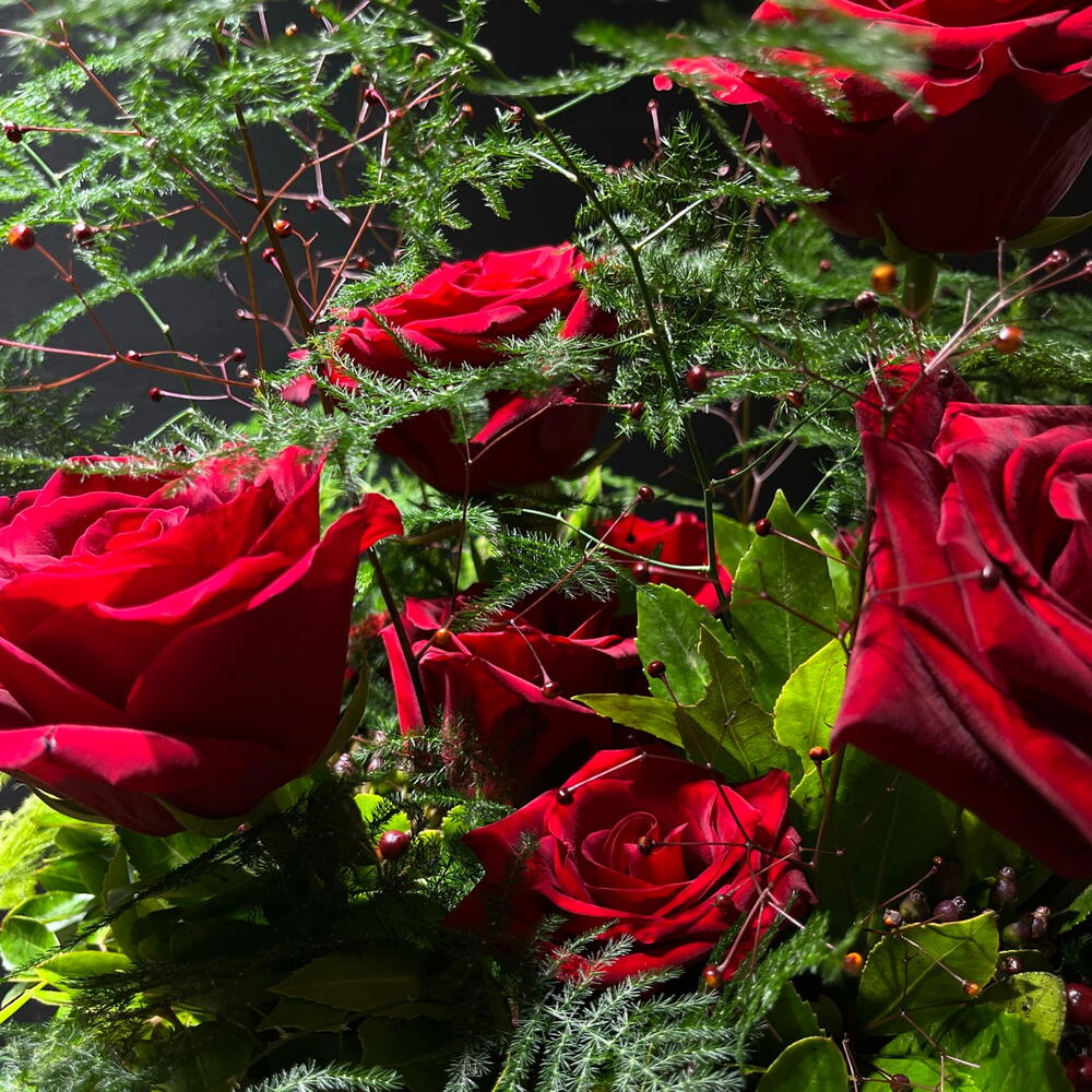 asparagus - 10 ud. ilex red - 5 ud. rosas rojas - 11 ud. marfull - 3 ud. vbox caja de papel - 1 ud.