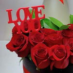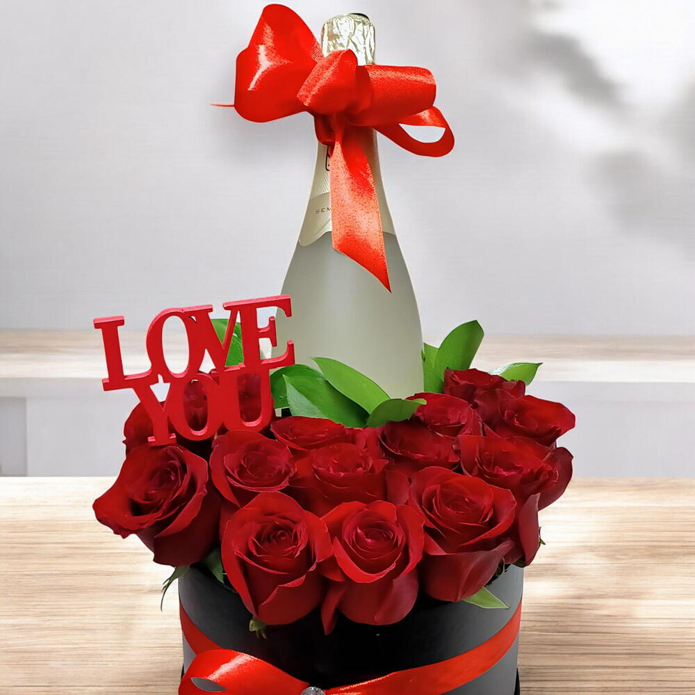 Arreglo de 14 rosas rojas con una botella de champagne en una caja negra elegante. Incluye envoltorio, pick LOVE YOU y lazada.